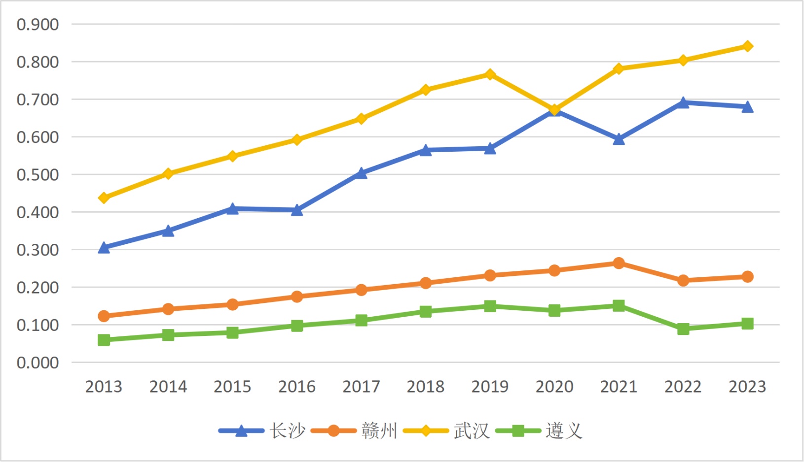 (2) 横向对比来看,这四个城市的耦合协调度具有明显的空间梯度差异,展现出“武汉 > 长沙 > 赣州 > 遵义”的稳定格局。其原因在于“产业结构高级化的驱动”与“资源依赖型路径锁定”之间的矛盾。