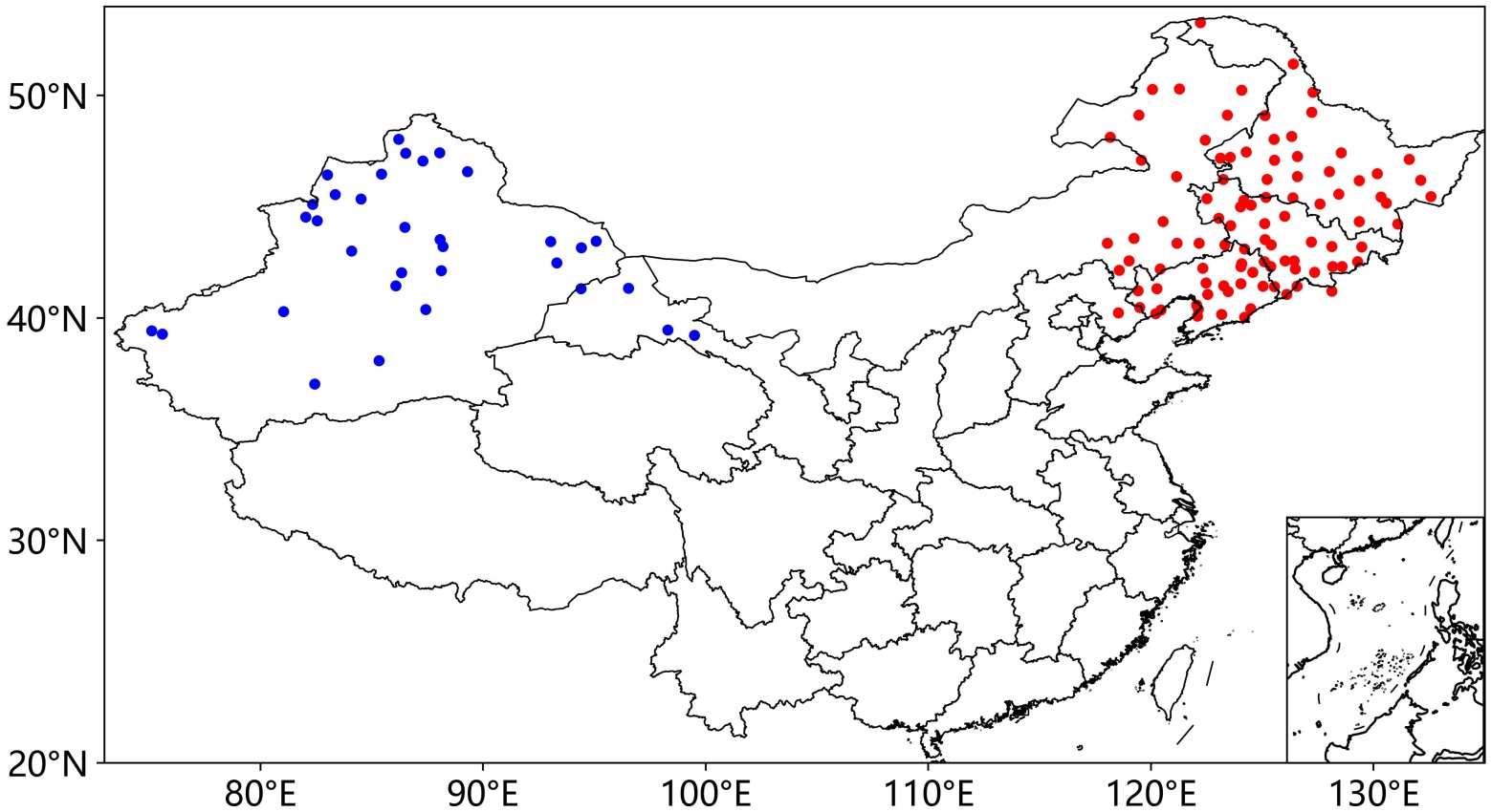 图1. 本研究所用站点的空间分布(蓝色散点为西北地区站点,红色散点为东北地区站点)