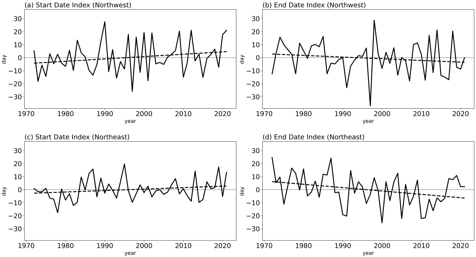 Figure 2. Time series of cold surge (a) start and (b) end index in Northwest China during 1972~2021; (c, d) as (a, b) but for Northeast China (dashed lines denote linear trends)