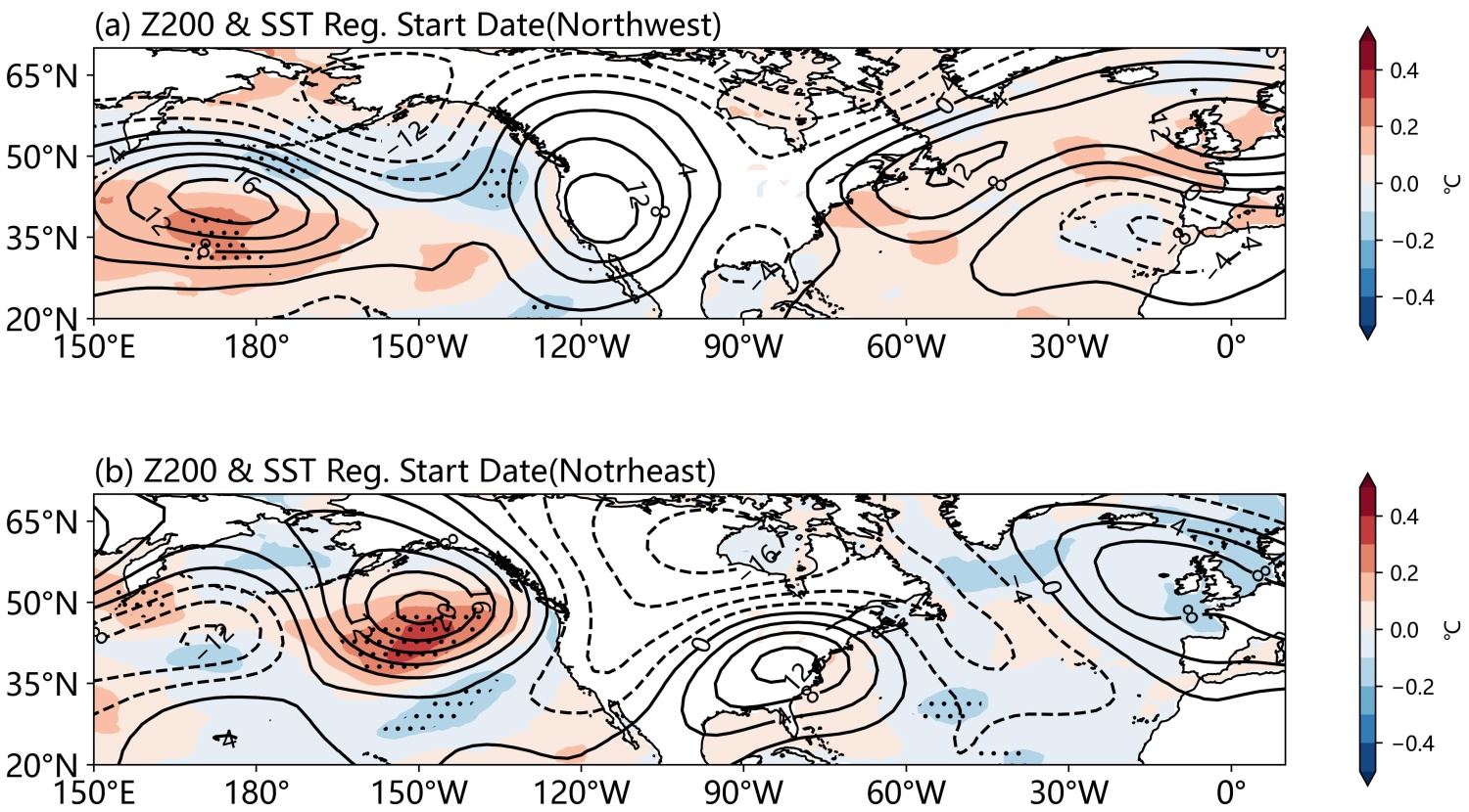 Figure 4. Regression of autumn 200 hPa hgt (contours, units: gpm) and sea surface temperature (SST) (shading, Unit: ˚C) on detrended cold surge start index of (a) Northwest China and (b) Northwest China during 1972~2021. Dotted areas denote SST anomalies significant at the 90% confidence levels