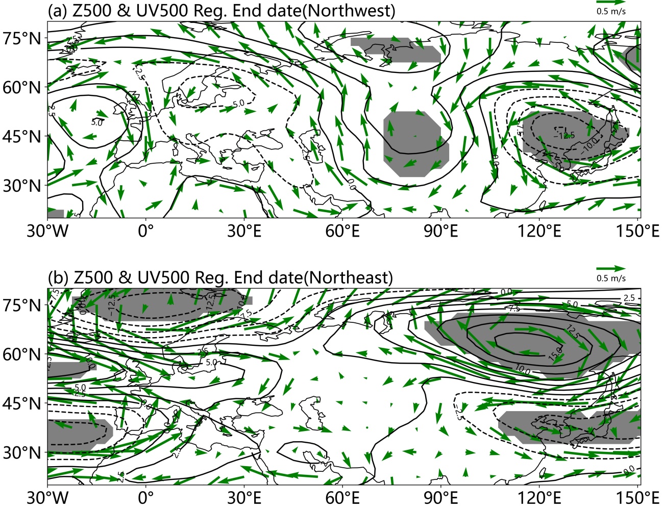 Figure 6. Regression of spring 500 hPa hgt (contours, units: gpm) and wind (vectors, Unit: m/s) on detrended cold surge end index of (a) Northwest China and (b) Northwest China during 1972~2021. Shaded areas denote hgt anomalies significant at the 90% confidence levels