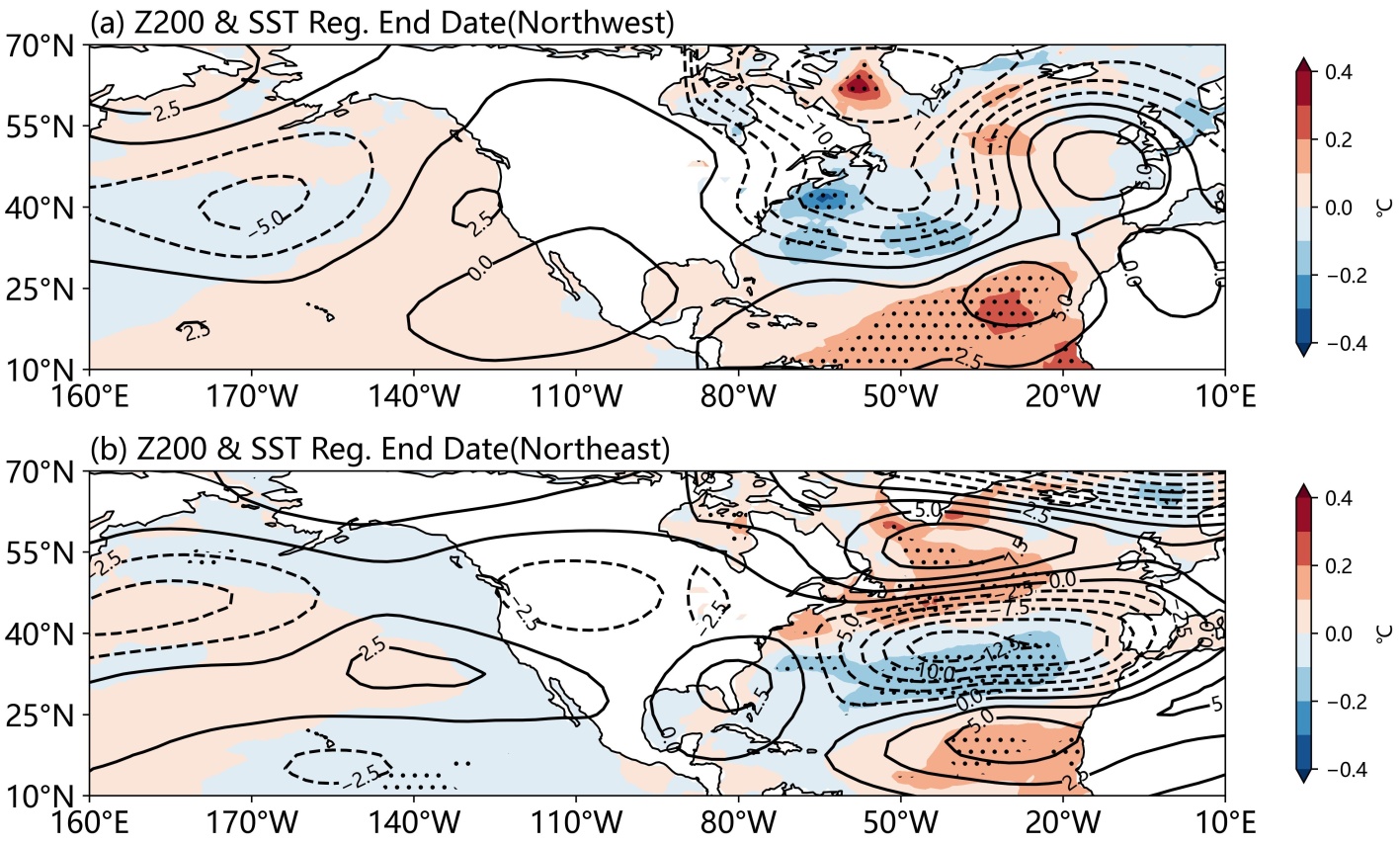 Figure 7. Regression of spring 200 hPa hgt (contours, units: gpm) and sea surface temperature (SST) (shading, Unit: ˚C) on detrended cold surge end index of (a) Northwest China and (b) Northwest China during 1972~2021. Dotted areas denote SST anomalies significant at the 90% confidence levels