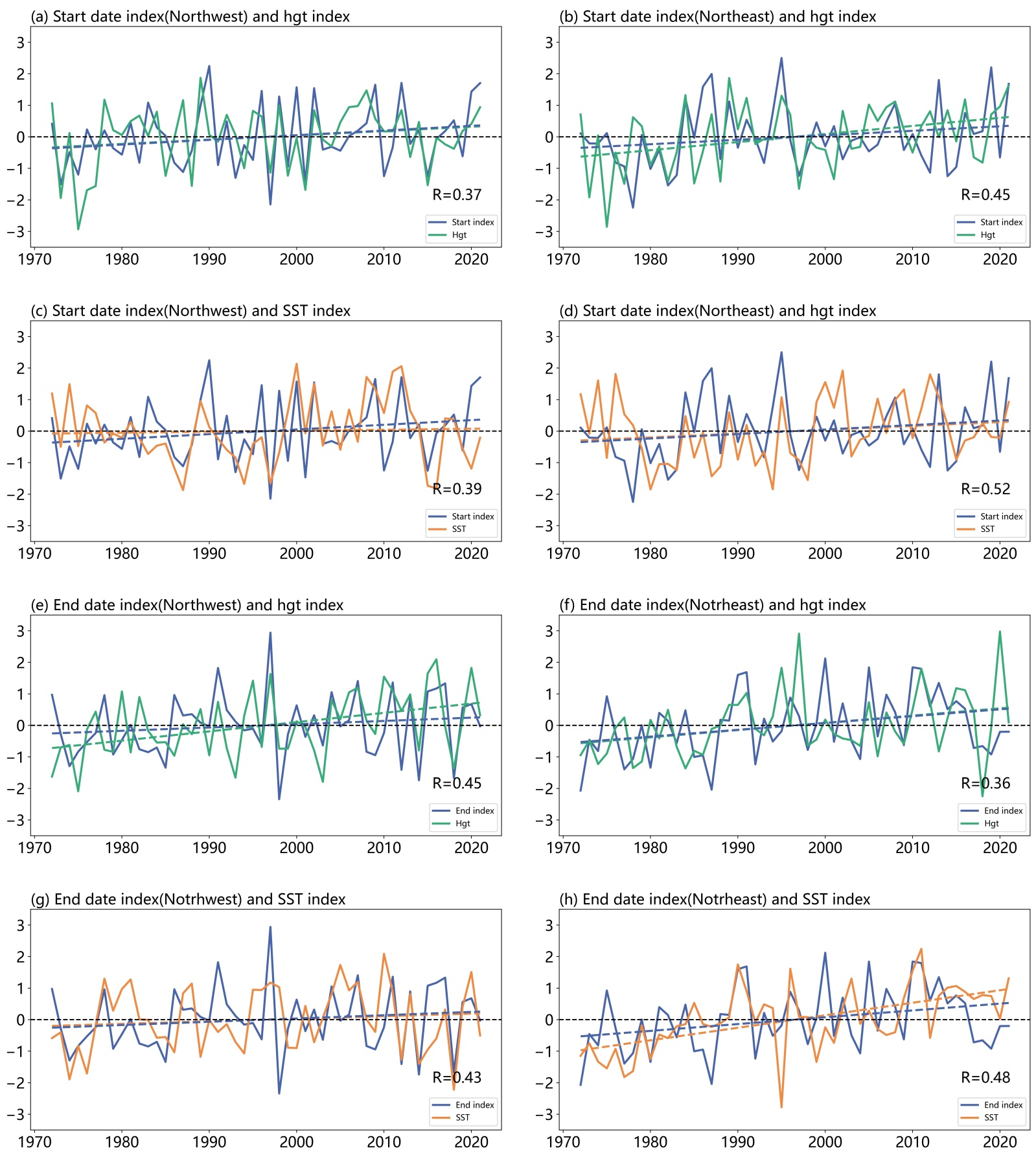 Figure 9. Cold surge start date index in Northwest China and (a) hgt index, (b) Pacific SST index in autumn; cold surge end date index and (e) hgt index, (g) Atlantic SST index in spring. (b, d, f, h) Same as (a, c, e, g), but for Northeast China. Dashed lines denote linear trends. The numbers in the lower-right corners indicate the interannual correlation coefficients after detrending (all are significant at the 95% confidence level)