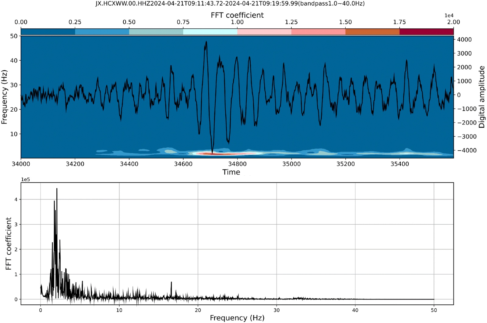 图中上部为时频分析图,该图采用连续小波变换生成,横轴为时间序列,左侧纵轴为频率,右侧纵轴为振幅。颜色深浅表示信号在特定时刻和频率上的能量强度,暖色调代表高能量区;下部为傅里叶频谱图,基于傅里叶变换生成,横轴为频率,纵轴为傅里叶系数的振幅,反映了信号在整个分析时间段内的全局平均频率成分。上方的时频图精确定位了微震事件的发生时刻并揭示了其频率成分随时间的变化过程,完美展示了信号的非平稳特性。下方的频谱图则从全局角度验证了事件的优势频率,并提供了信号的总体频谱结构。两者结合,为研究者全面解读微震信号的动态特性和频率属性提供了强有力的证据。软件将此两种视角集成于同一界面,极大地便利了对比分析与深入解读。