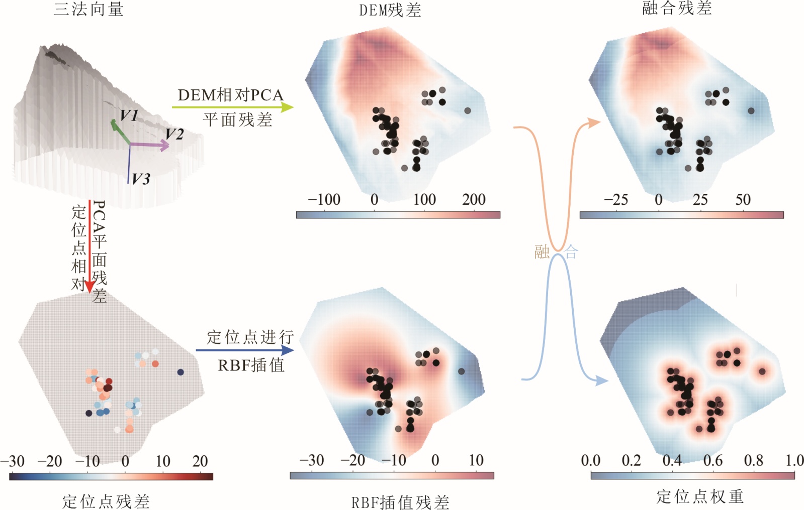 针对微震事件在滑坡体内部分布不均的特征,本研究采用主成分分析(PCA)与趋势面–残差融合拟合相结合的方法,对潜在滑动面进行三维几何建模。具体而言,首先通过PCA确定微震事件点云的主优势方位,初步提取滑动面的宏观趋势特征;继而采用趋势面拟合方法构建滑动面的背景几何形态,并通过残差分析捕捉局部结构调整量;最终通过趋势结构与残差场的融合,实现滑动面三维形态的高精度重建。