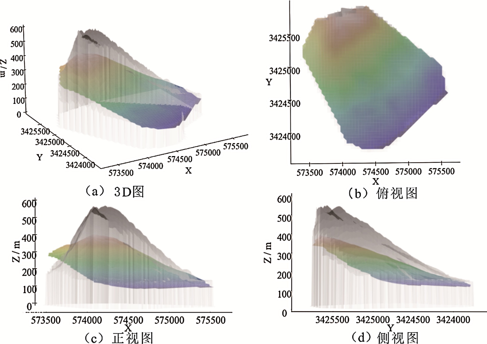 最终叠加趋势面与融合残差场得到可以表达整体趋势与局部扰动特征的滑动面模型。如图9所示为滑动面三视图。