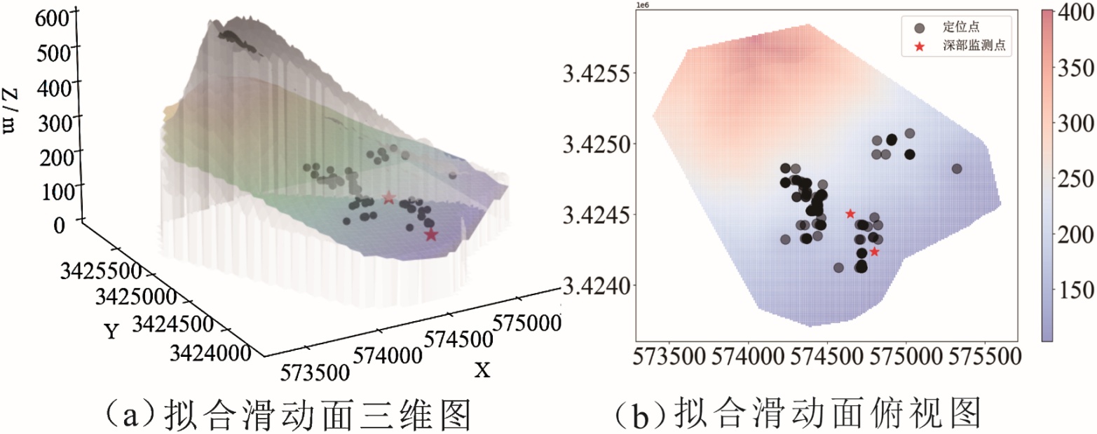 该方法有效克服了因微震事件空间分布不均导致的形态刻画困难,能够在稀疏观测条件下恢复滑动面的连续几何特征,为滑坡灾害的稳定性评价与防治措施制定提供重要的结构依据。如图8所示为滑动面拟合过程。