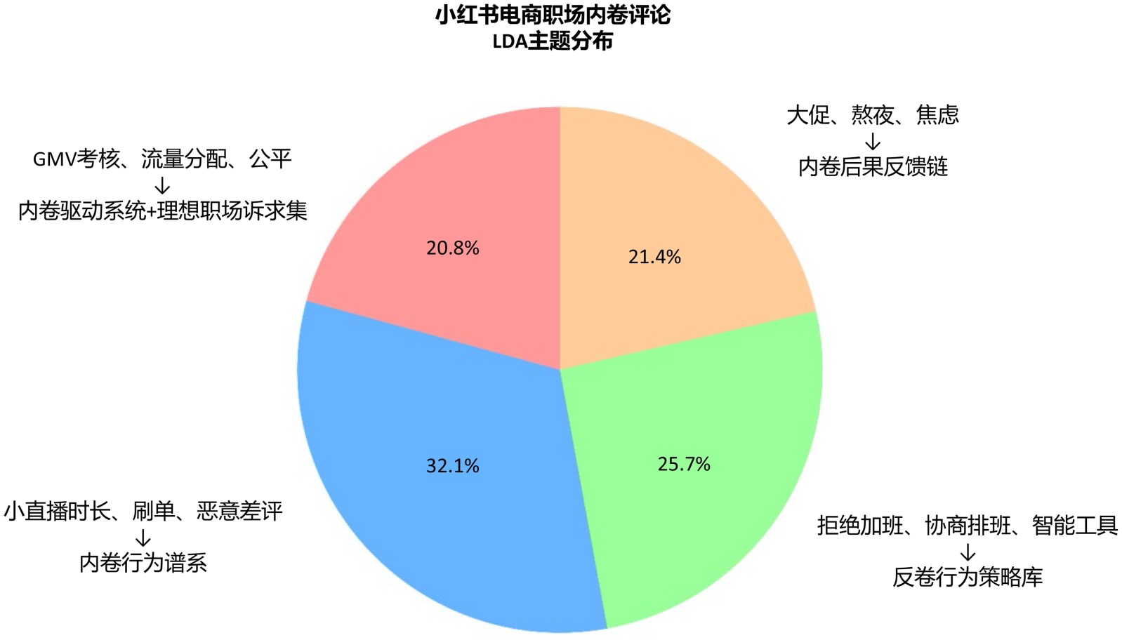 本研究以小红书平台467条电商职场内卷相关评论为样本,运用扎根理论探究其形成机制、特征、效应与应对路径,构建“电商行业职场内卷的动态循环与反卷响应”四层闭环模型,并结合LDA主题建模与情感分析进行量化验证,双重方法相互印证,保证了结论可靠性。研究虽未完整展示文本分析过程,但核心结果已为模型提供量化支撑,为破解电商内卷问题提供理论与实践参考。