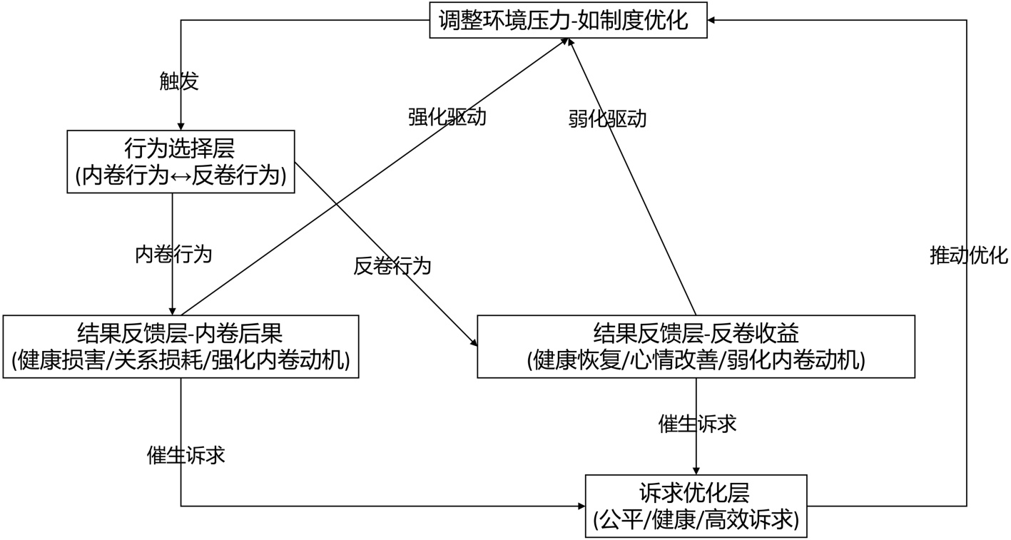 模型的“循环强化/打破层”,行为结果反向影响驱动层:内卷后果会强化内卷动机,反卷收益会弱化内卷驱动 |