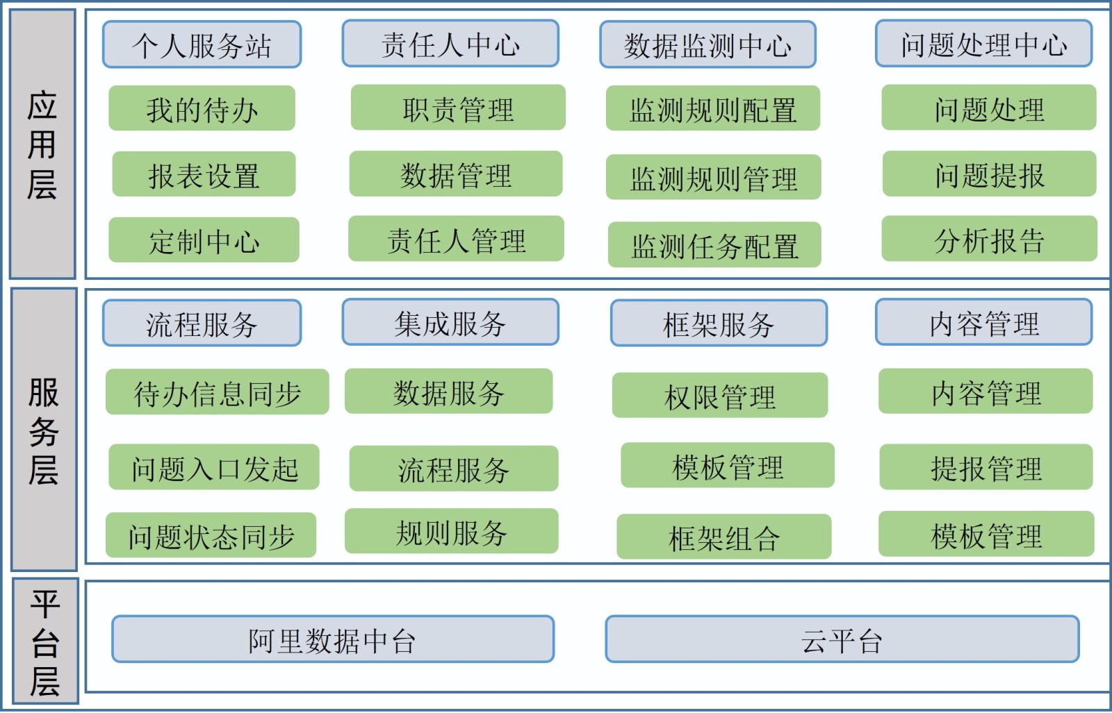 3) 应用层。打造数据责任人管理工具,包括数据主人个人服务站、责任人中心、数据监测中心和问题处理中心。平台通过提供配置工具,让各类数据责任人灵活配置,搭建个人特色的数据责任人工作空间平台,提升各层级数据责任人查数、治数和管数工作效率。