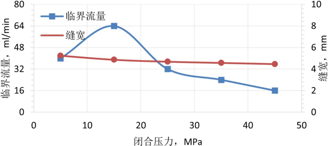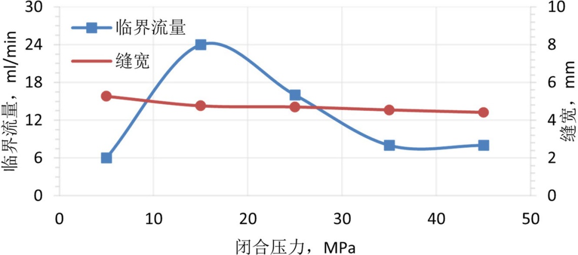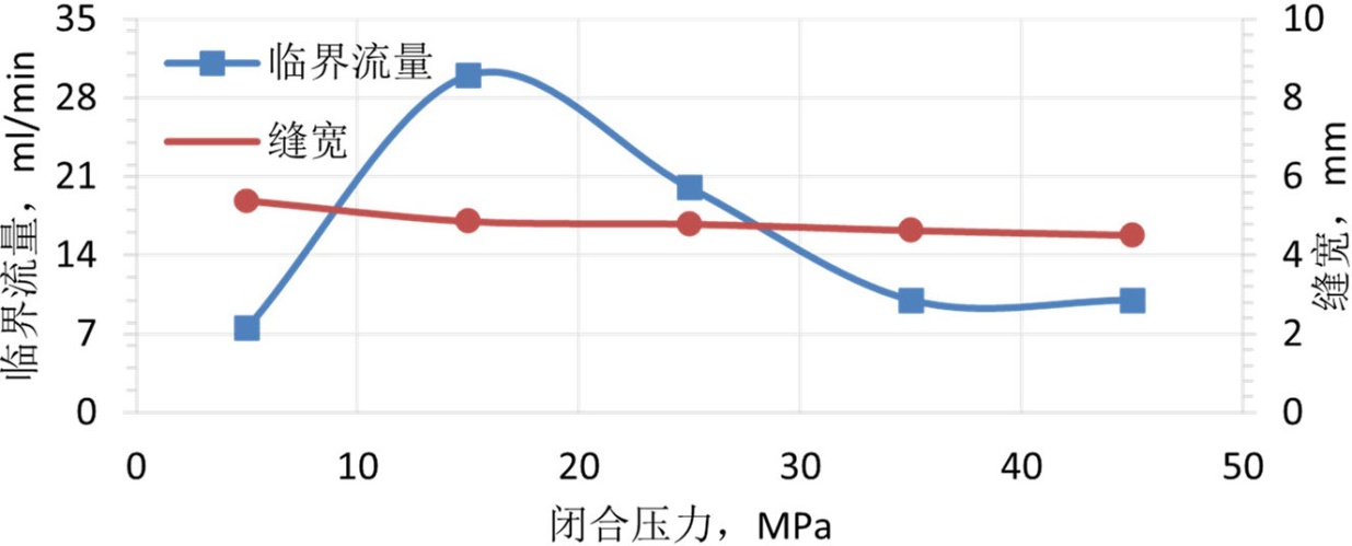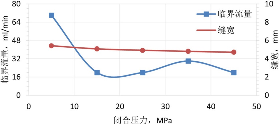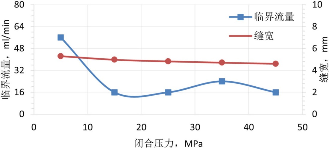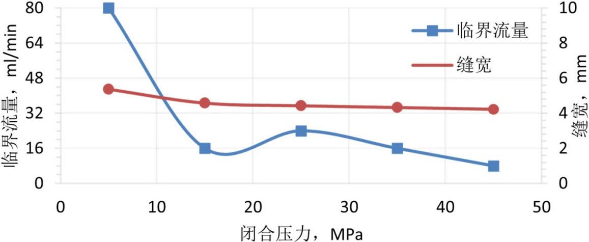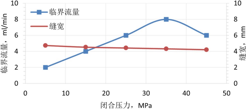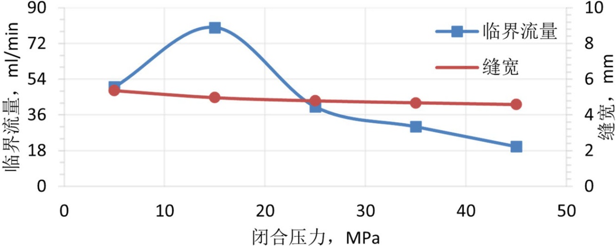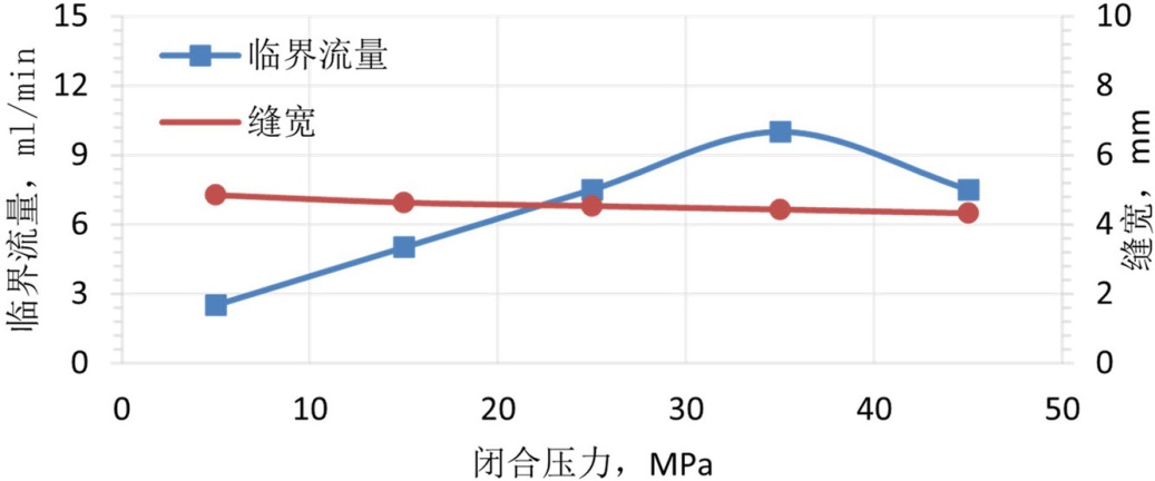 将处理好的支撑剂装入导流室的裂缝模型中,随后将导流室置于液压机上,施加5.0 MPa的初始闭合应力。接着,连接回流集砂器及下游管线以构成完整的回流测试系统,并设定预热罐与导流室至目标温度。待导流室温度稳定至设定值并保持15分钟后,以10 mL/min的初始流量向系统内泵入预制好的低黏度破胶液。实验过程中密切监测下游集砂器,若其内液体出现浑浊或可见支撑剂颗粒,则判定发生支撑剂回流,随即停止实验,记录此时的临界流量与实时缝宽。单次压力点实验完成后,以10 MPa为增量逐级提高闭合压力至下一预设测试点(预设压力点为5 MPa、15 MPa、25 MPa、35 MPa、45 MPa,覆盖现场常见闭合压力范围),稳压10分钟后重复上述温度稳定、压裂液注入、回流监测及数据记录步骤。直至完成所有预设压力条件下的实验。