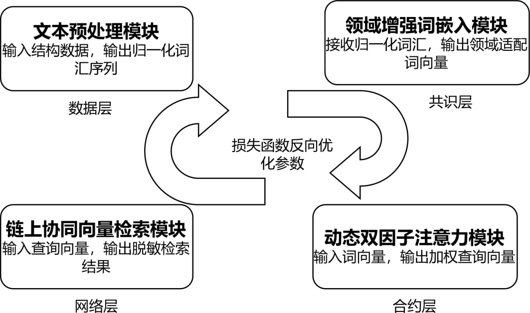 1) 数据流关联:文本预处理模块的归一化词汇序列输入领域自适应词嵌入模块,生成的文本向量与用户查询向量共同输入动态双因子注意力模块,该模块的加权查询向量作为链上链下协同模块的检索条件。
