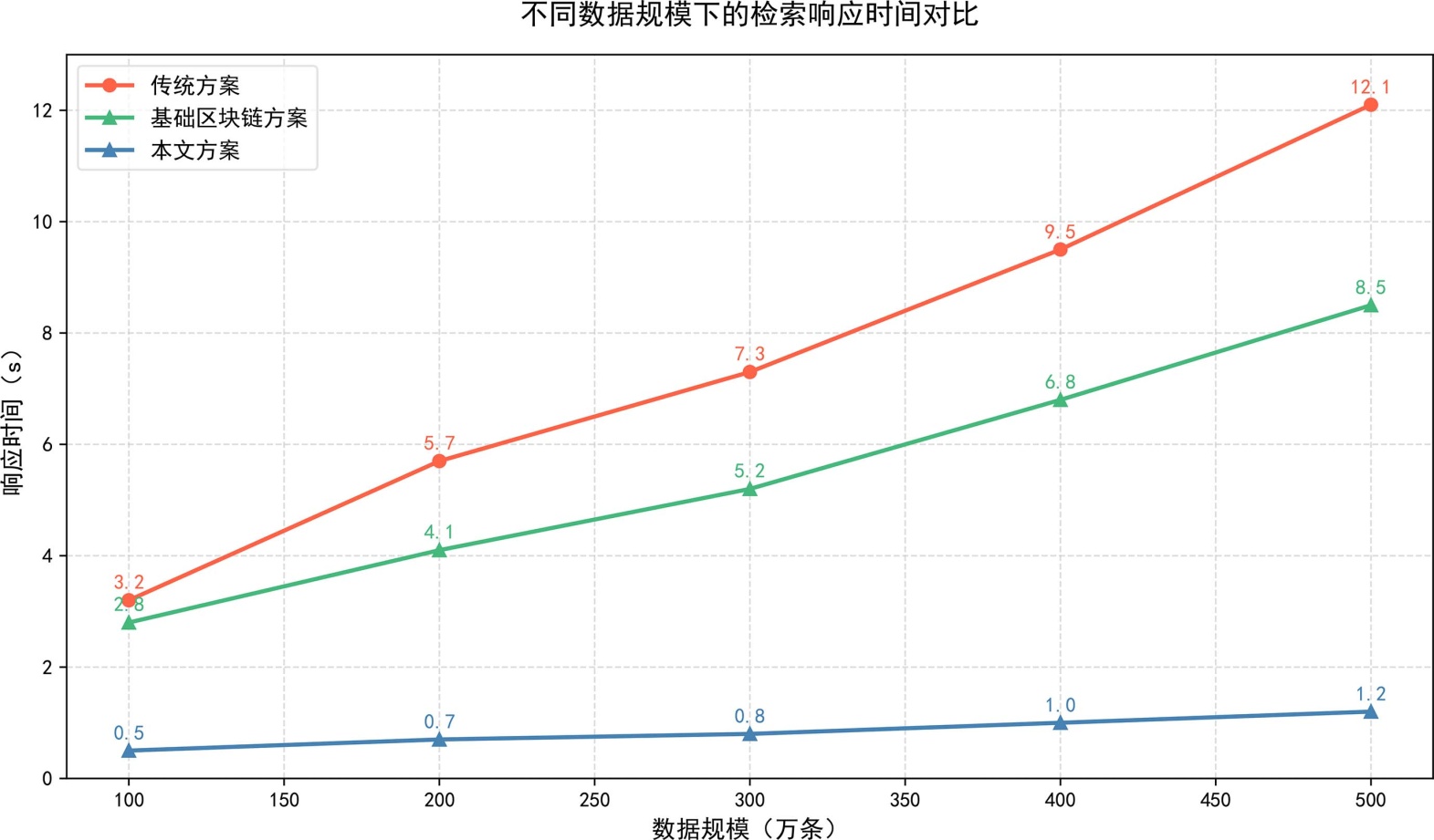 传统方案无权限管控,所有用户可访问全量数据;基础区块链方案权限规则未完全固化,存在越权检索(如科研单位访问其他单位数据);本文方案通过合约层固化权限规则,应用层严格调用合约校验,权限管控准确率100%,验证合约层与应用层的协同有效性。