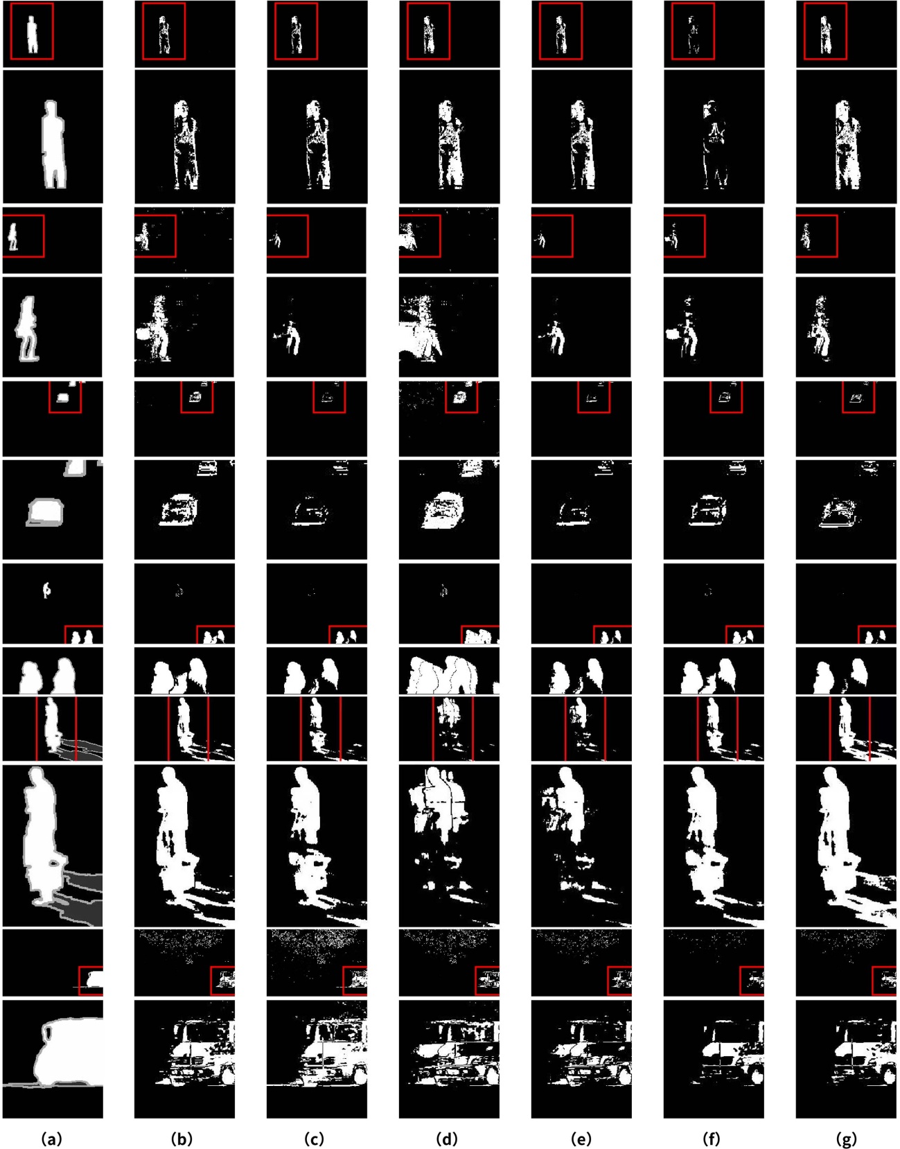 从表1可以观察到,本文提出的eLLp-L1-TV方法在绝大多数序列上均取得了最高的F-measure值。综合所有五个序列,本方法的平均F-measure达到0.762。定量结果一致且有力地证明,eLLp-L1-TV模型通过协同非凸低秩逼近与空间正则化,在不同类型的挑战性场景中均能实现更优、更鲁棒的前景背景分离性能。
