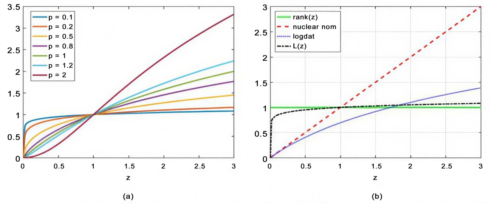 时针对多个p值的表现。图1(b)比较了秩函数及其一些松弛,如核范数、log-determinant函数和函数