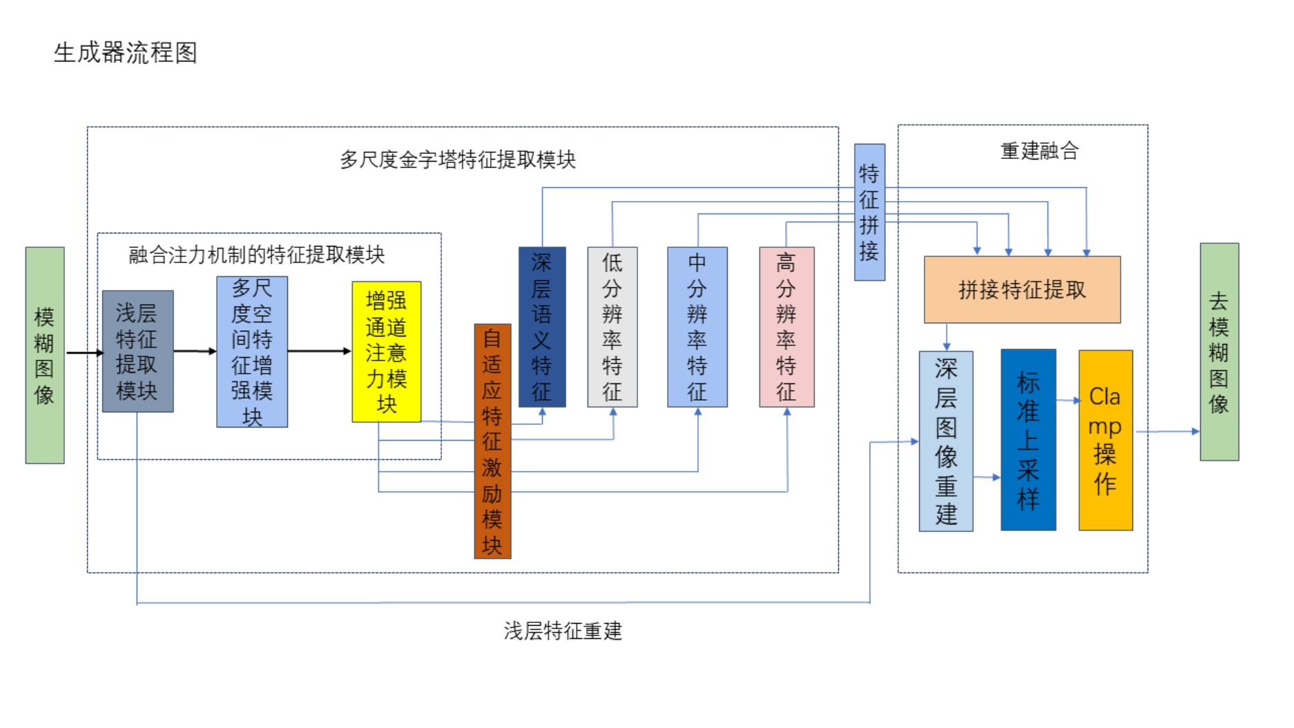 随后通过包含深层卷积块和混合上采样的自适应特征模块将不同尺度的特征恢复到同一空间维度,以此作为图像去模糊的基础。