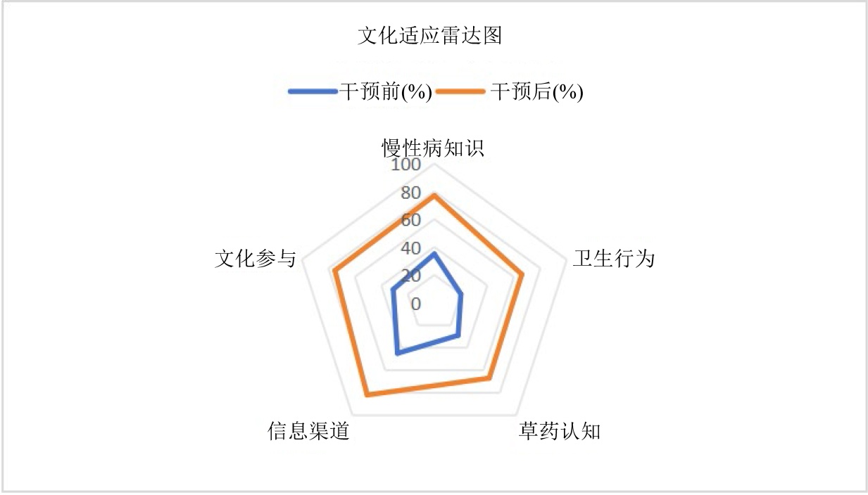 · 图表说明:雷达图生动地显示,干预后五个维度的指标均向外大幅扩张,形成一个更饱满的多边形。这直观证明了干预模式在健康素养多个维度上的全面提升效果,尤其在“卫生行为”和“草药认知”等初始薄弱环节提升最为显著,凸显了该模式在弥合文化裂隙上的全面性。