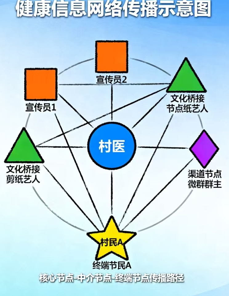 · 图表说明:网络图中,“村医”和“健康宣传员”是连接最多的核心节点,“文艺骨干”(如剪纸艺人)和“微信群主”是重要的枢纽节点。该图清晰地揭示了健康信息通过“核心节点→枢纽节点→普通村民”的扩散路径,证明了培育本地、跨领域的意见领袖对于信息广泛、高效传播的关键作用,为干预的可持续性提供了可视化的证据。该示意图为结构性展示,不涉及定量社会网络分析。