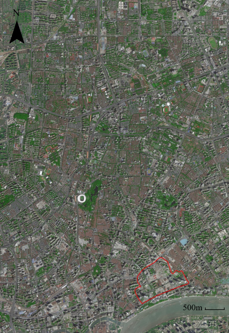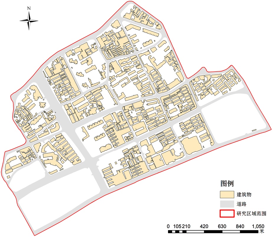 研究区域位于上海市虹口区南部北外滩核心区,其范围为由周家嘴路–公平路–唐山路–海门路–东大名路–旅顺路–东汉阳路–商丘路围合而成的区域,总占地面积约0.84 km2。核心区各用地类型占比分别为公共设施用地45.6%、绿化用地10.5%、居住用地11.7%、道路广场用地28.1%、其他用地4.1% (合计100%)。研究区域地理位置及范围见图1。