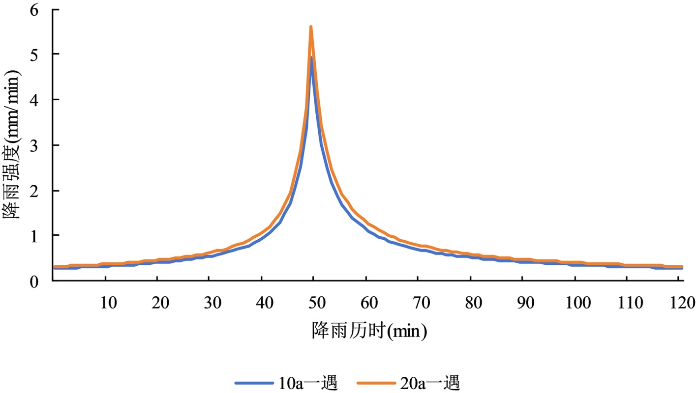 依据上海市地方标准《暴雨强度公式与设计雨型标准》(DB31/T 1043-2017),结合研究区域高密度建成区雨洪汇流特征,确定本次模拟的设计降雨条件。为精准模拟极端降雨下排水系统及调蓄设施的运行响应,本次研究采用芝加哥雨型构建设计暴雨情景,该雨型能够较好地拟合上海市暴雨时空分布特征,适配高密度城区短历时、高强度的降雨规律。模拟共设置两种重现期设计降雨,分别为10a一遇、20a一遇,统一设定降雨历时为2 h,时间步长为1 min,雨峰系数为0.4,雨峰时刻为48 min,确保降雨数据的精细化程度满足调蓄设施调度模拟需求,为后续不同调度情景下的雨洪调控效能分析提供可靠的水文驱动条件。设计降雨见图5。