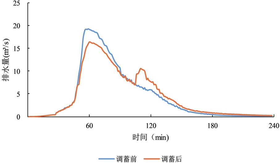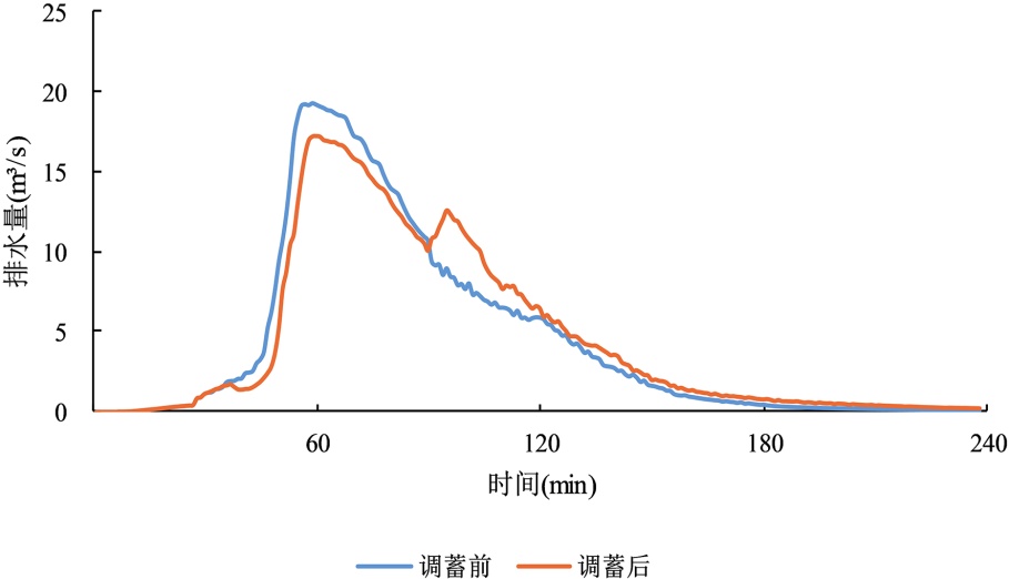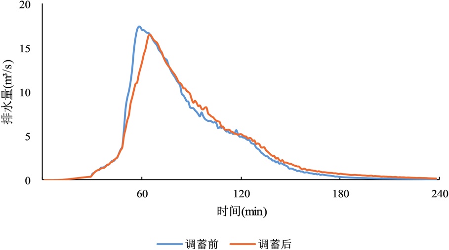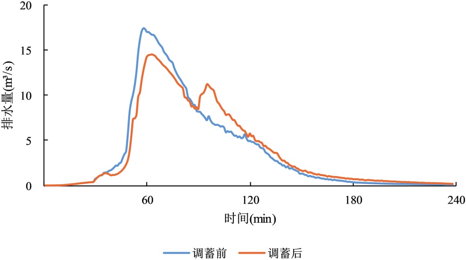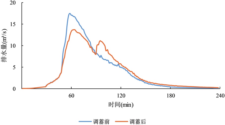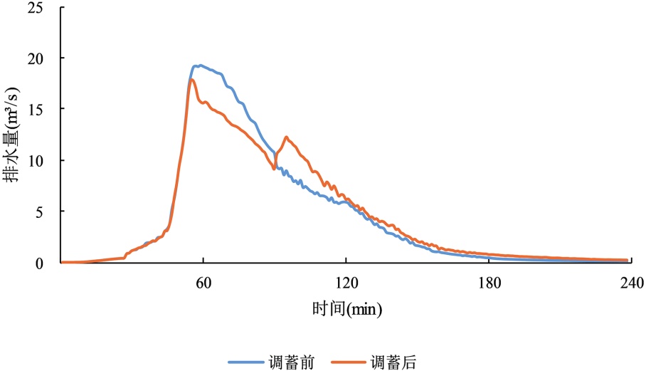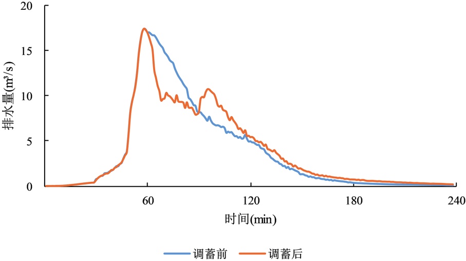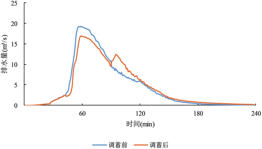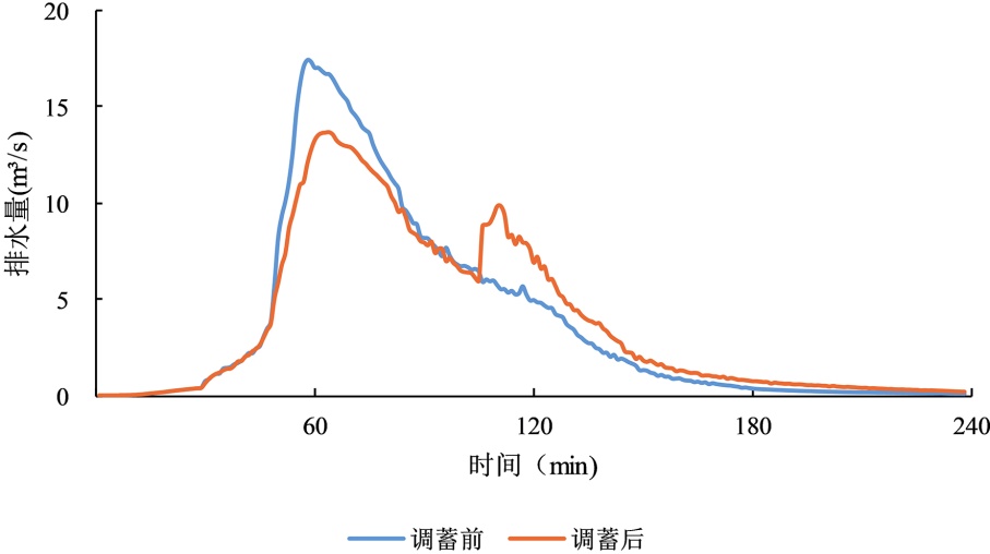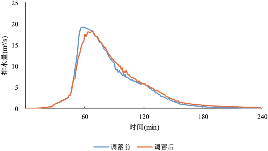 表3. 不同短历时设计暴雨下调蓄池启用与否排水口峰值流量对比