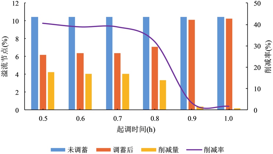 4.2. 调蓄池启用时刻对溢流节点削减效果的影响