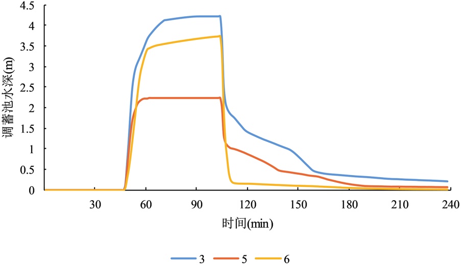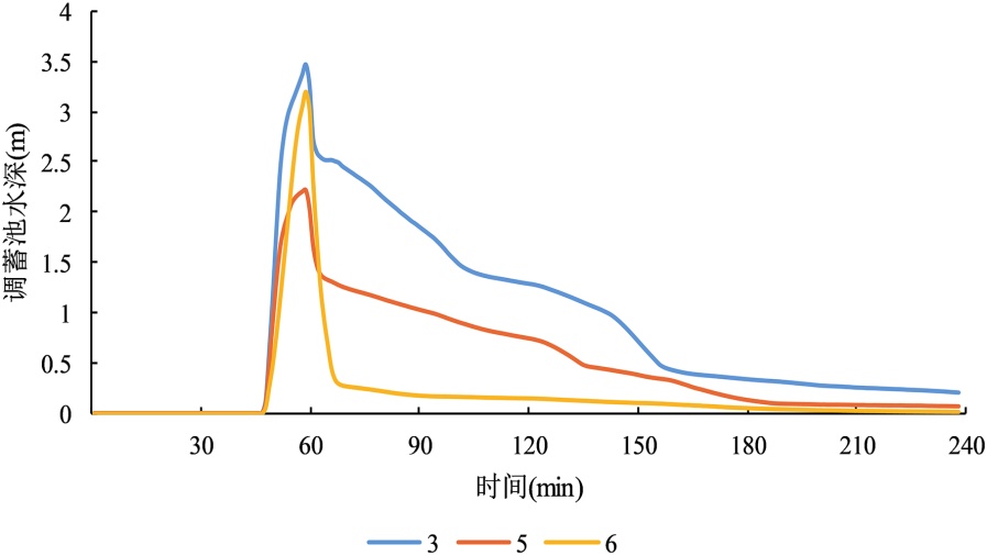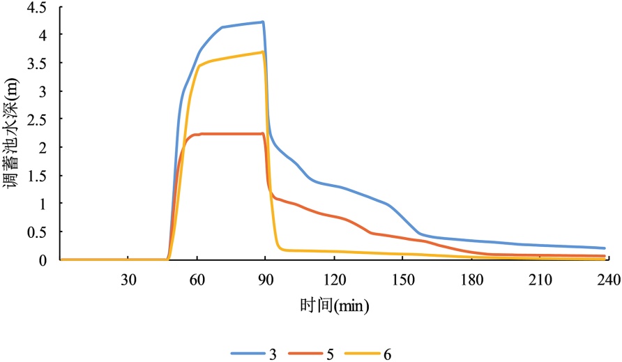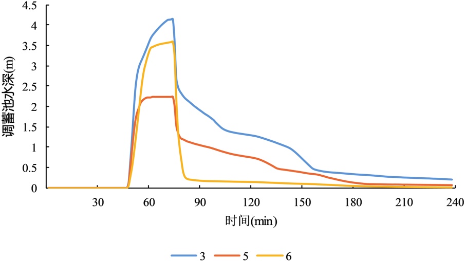 排水时间直接决定调蓄池储水时长与削峰效能:泵站60 min启动时,调蓄池储水时间极短,削峰作用难以发挥;75 min启动时储水时间仍较短,易引发后期流量反弹,削峰效果有限;90 min、105 min延迟启动时,调蓄池水深在峰值附近维持更久,储水时间充足,既保障了削峰效果,又为排水系统应对后期汇流提供有效缓冲,提升了系统运行稳定性。