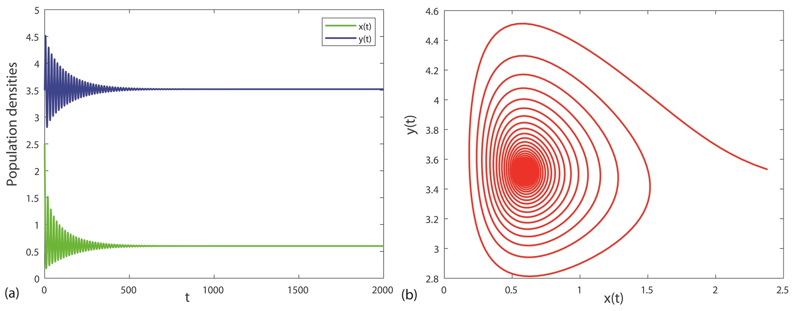 图1. 确定性系统的捕食者与食饵种群动力学行为与相图