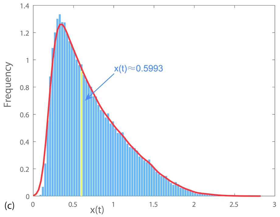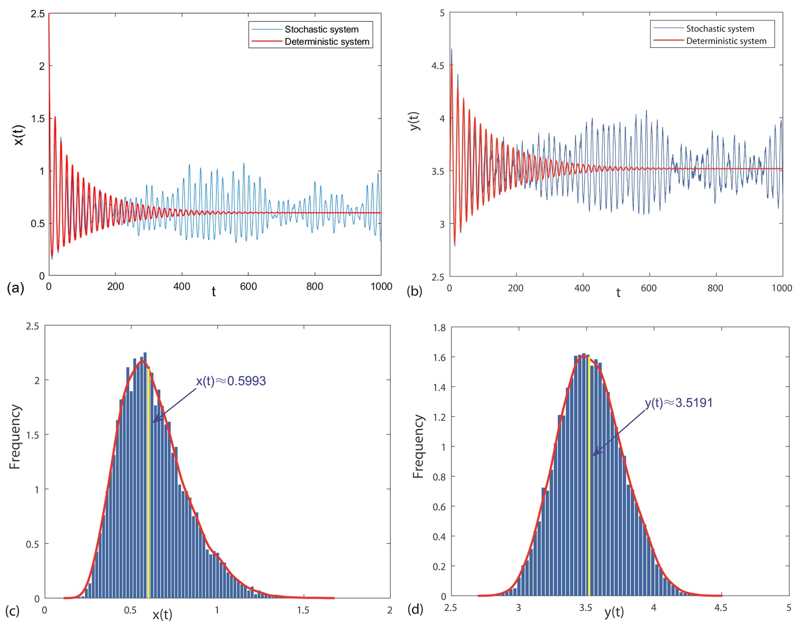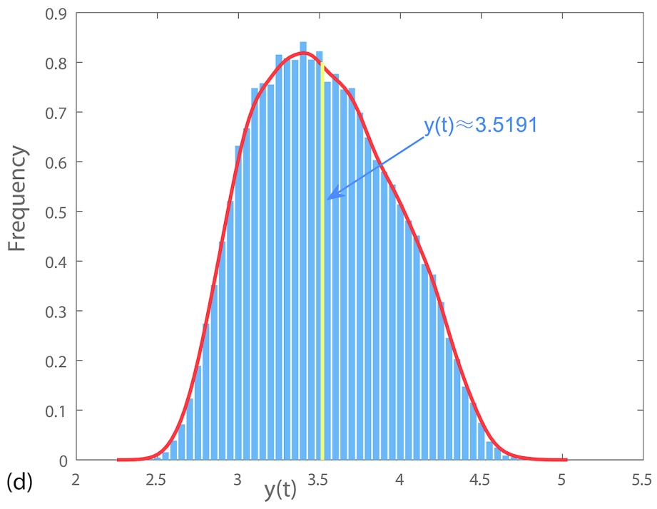 时,不难验证定理3.3与定理3.4成立,因此系统(1.1)满足均值持久性,且存在唯一的平稳分布(见图3)。值得注意的是,从图3(a)和图3(b)中可以观察到,系统(1.1)的种群密度在其对应确定性系统稳态的小邻域内波动,这表明强度较弱的环境白噪声,长期来看无法改变捕食者与食饵种群的生存状态,会以均值稳态的生长共存模式存在。此外,捕食者与食饵的种群密度分别在区间(0.1, 1.6)和(2.7, 4.5)内呈正态分布,其中红色曲线代表捕食者与食饵种群的概率密度函数,矩形的宽度表示不同组距,矩形的高度则对应组频。有趣的是,捕食者与食饵种群密度分布的频率峰值分别出现在0.5993和3.5191处(见图3(c)、3(d)),这两个数值几乎以确定性系统的稳态平衡点为中心。换言之,在此条件下系统的稳定性表现更为突出,生长共存模式是以平衡点为中心的均值稳态。当系统处于中等噪声强度
