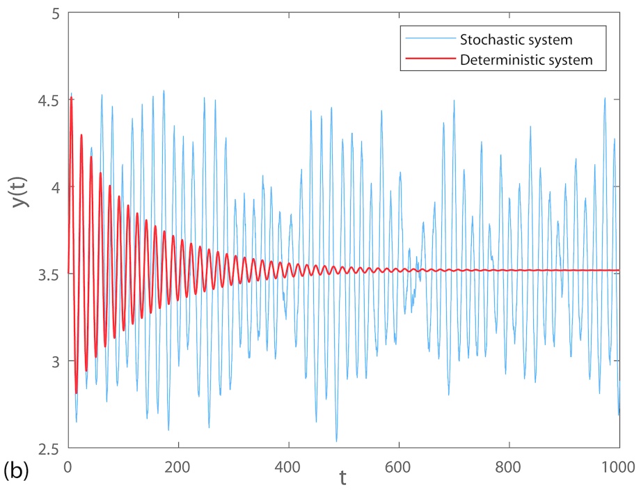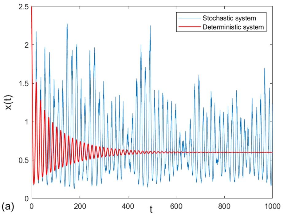 在种群生态模型的构建中,向确定性模型引入随机性的方式具有多样性,其中两种核心手段因适配性强、贴合实际研究场景,被广泛应用于相关研究。第一种常用手段为参数扰动法,旨在通过修正模型参数来量化环境变异性对种群动态的影响,具体操作是将确定性模型中固定不变的参数(如种群增长率、死亡率),替换为该参数的均值与随机误差项之和[10] [11]。从理论层面来看,根据中心极限定理,这类随机误差项会呈现正态分布特征,而该分布与自然环境中普遍存在的高斯白噪声具有高度适配性,因此可近似为高斯白噪声[12],目前该参数扰动策略已在各类生物种群模型中获得广泛应用与验证[13]-[15]。另一种核心手段为方程扰动法,区别于参数层面的调整,其通过直接在种群生长方程中嵌入随机扰动项实现随机性引入,且扰动强度的大小与状态变量(如种群生物量)偏离其确定性平衡态的程度正相关[16]。该方法的优势在于,不仅能够助力研究人员探究确定性动力学系统的恢复能力,还可深入解析系统长期演化中的随机行为特征[17],因其在生物系统(尤其是种群生态系统)研究中展现出显著的有效性与实用性,已成为学界的研究热点,受到广泛关注[18] [19]。两种方法互补适配,为揭示随机环境下种群动态规律提供了重要技术支撑。