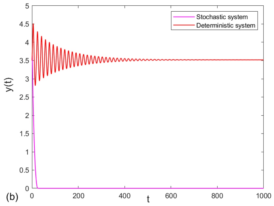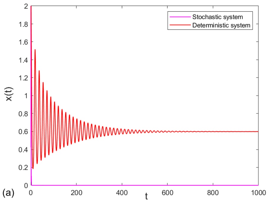 本小节将通过数值模拟,验证理论结果的有效性,并进一步探究随机系统(1.1)的复杂动力学行为。具体地,采用Milstein高阶方法[30],探究环境白噪声对系统(1.1)的影响。在后续数值模拟中,除特别说明外,参数取值均如下: