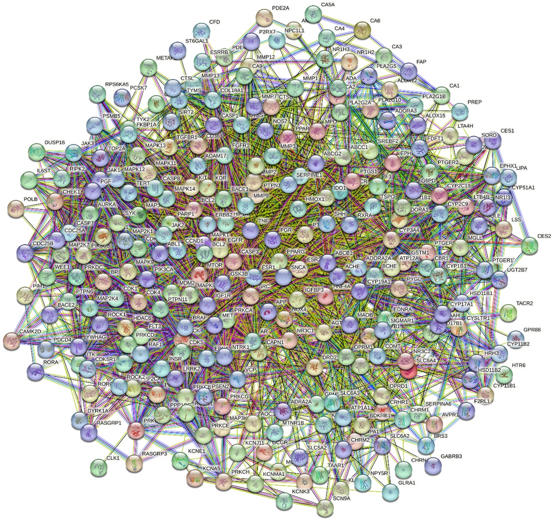 将2.2.4节获得的交集靶点导入STRING数据库,在检索方式中选择“Multiple proteins”,物种限定为“Homo sapiens”。运行分析后获取交集靶点的蛋白–蛋白互作(PPI)网络。在参数设置中勾选“enable 3D bubble design”以呈现3D节点样式,同时启用“hide disconnected nodes in the network”以屏蔽网络中未与其他节点相连的离散节点。将PPI网络构建的置信度得分阈值设定为0.4,并将相互作用结果导出为TSV格式文件。