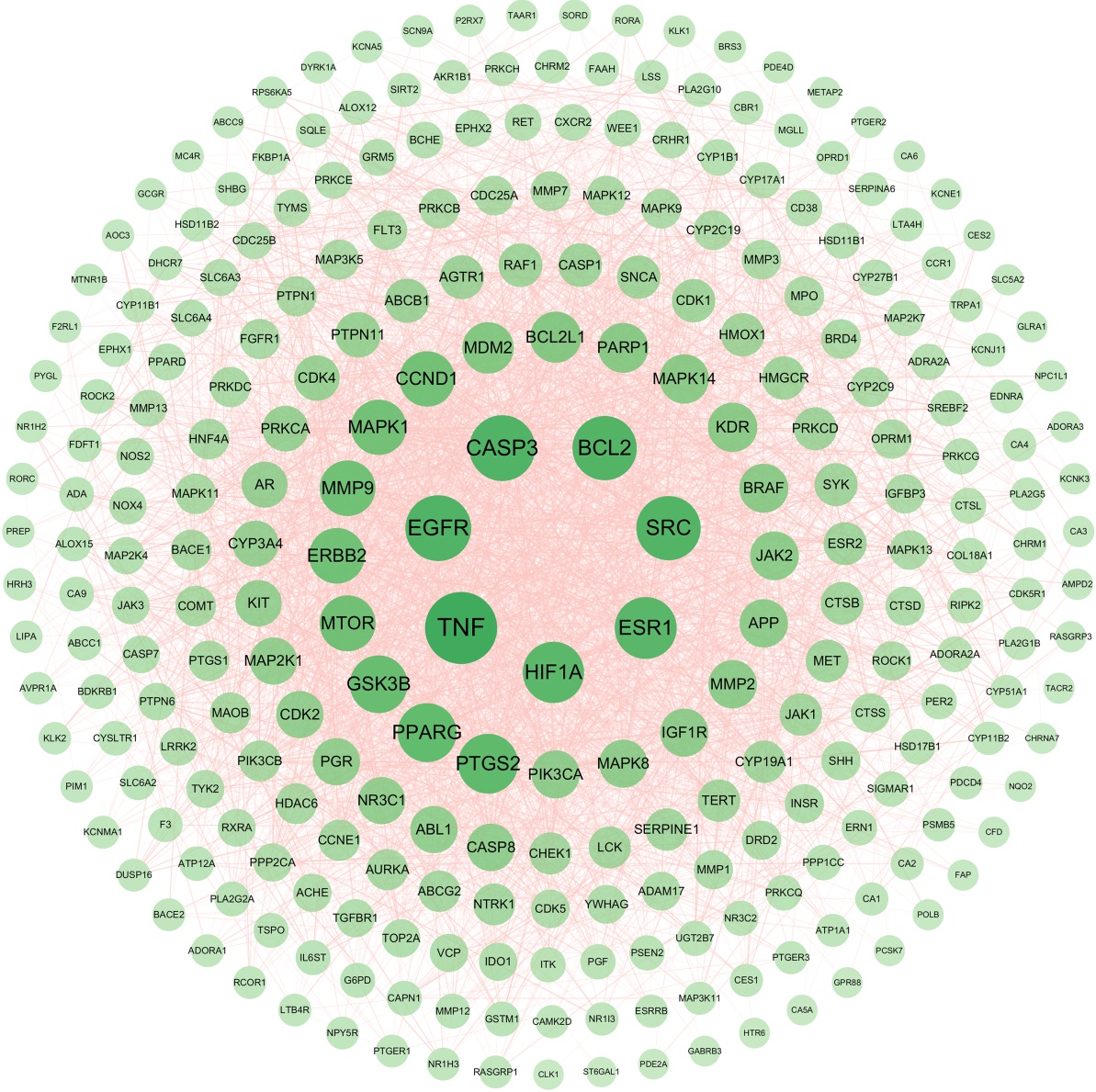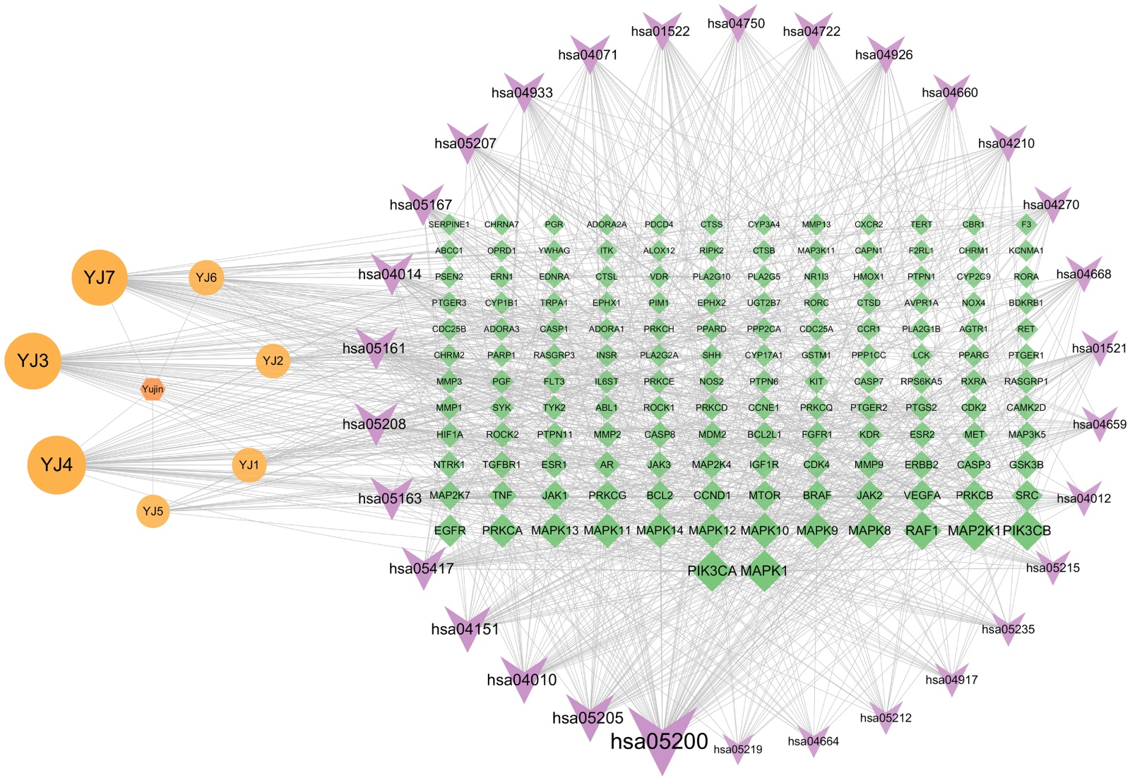 Figure 7. “Traditional Chinese medicine - active ingredients - common targets - pathways - diseases” network diagram