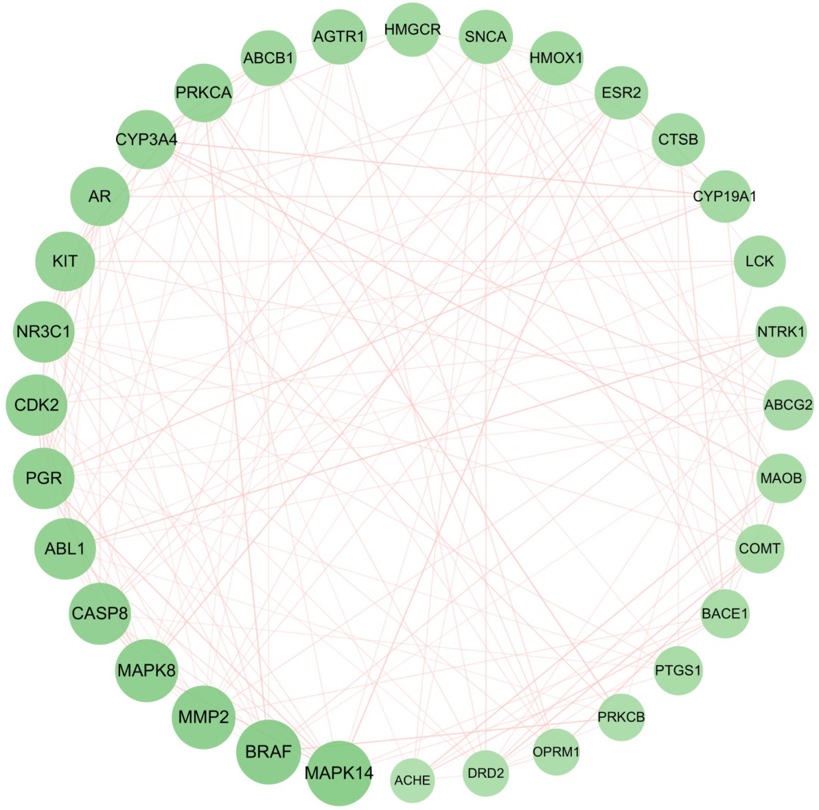 根据图2与图3所示的交集靶点PPI网络统计特征:网络包含274个节点与3683条边。在图4中,可见32个核心靶点相互作用关系,其中MAPK14、BRAF、MMP2、MAPK8、ABL1、PGR度值排名最高,且与其他靶点相互作用更强,Degree分别为64、63、61、60、58、57,可能是中药治疗胆管癌潜在作用靶点。