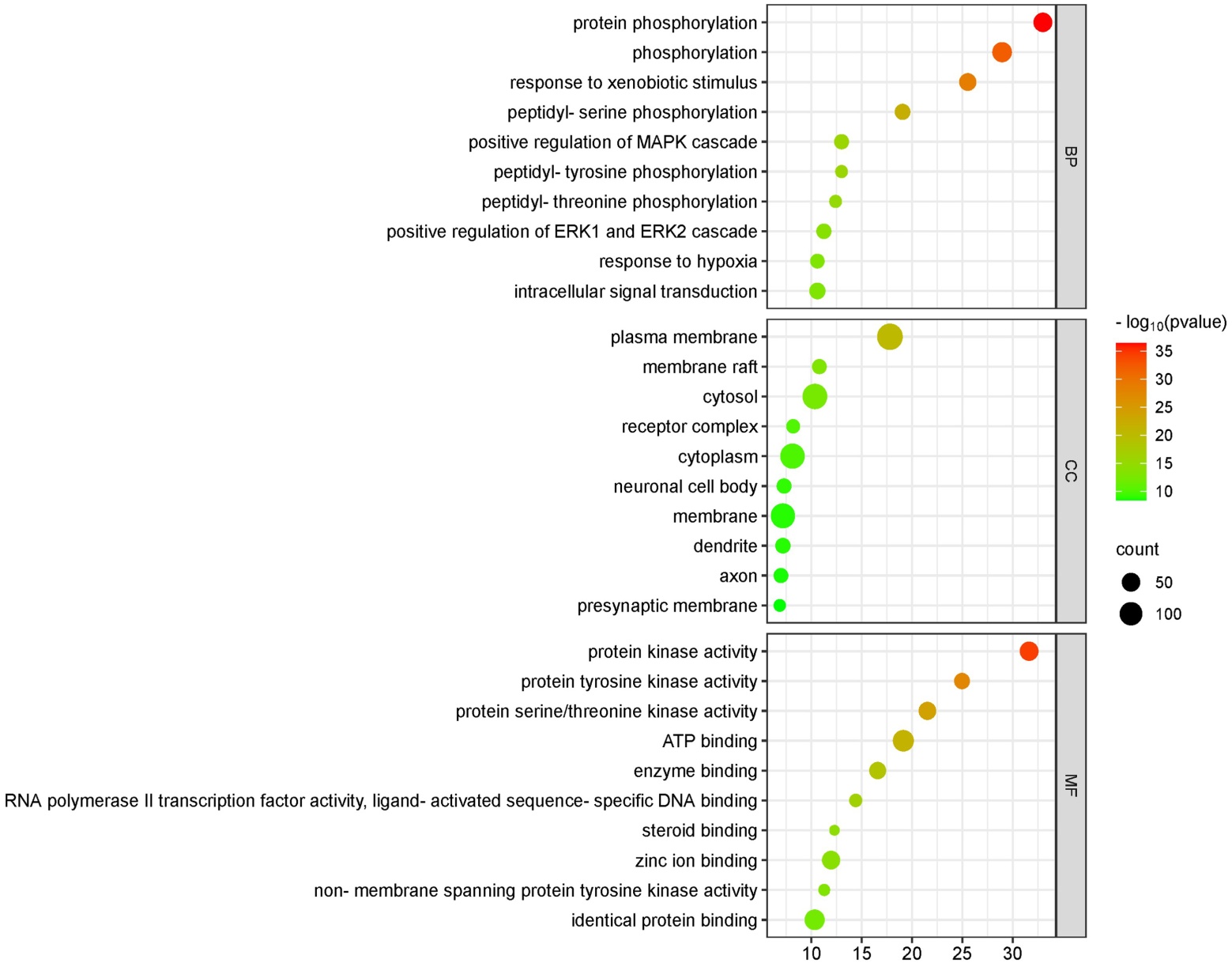 将2.2.4节获得的中药–胆管癌交集靶点导入DAVID数据库,物种参数设定为“Homo sapiens”,完成运行后获得GO功能注释及KEGG通路富集的结果文件,并导出保存至Excel中进行分类汇总与整理。本研究以P < 0.05作为显著性判定标准:在GO富集分析中,分别从生物过程(BP)、细胞组分(CC)与分子功能(MF)三类结果中筛选富集程度排名前10的条目;在KEGG通路富集分析中提取显著性排名前30的通路作为重点关注对象。上述筛选结果进一步上传至微生信在线平台进行可视化展示,绘制标准化的富集气泡图谱;随后对所得GO功能气泡图与KEGG通路气泡图进行系统性解读与分析。