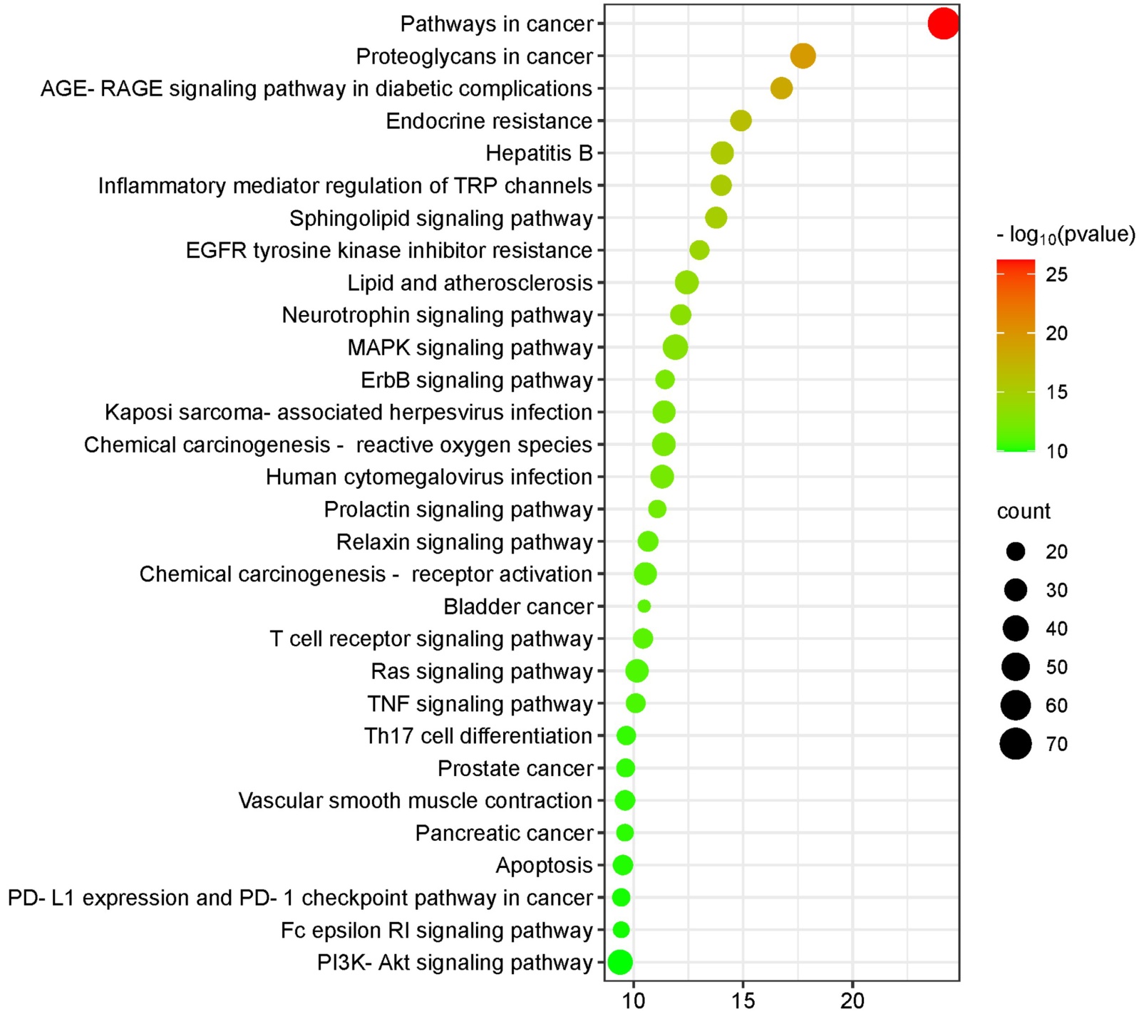将3.2节获得的交集靶点导入DAVID数据库进行富集分析,共检出1290条显著相关的富集条目,其中生物过程(BP) 829条、细胞组分(CC) 99条、分子功能(MF) 188条,KEGG通路174条。以P < 0.05为显著性筛选标准,分别提取GO分析中BP、CC、MF三类结果的前10个富集条目,以及KEGG通路分析中前30条显著富集通路,并将筛选结果导入微生信在线绘图平台进行可视化展示。GO富集气泡图见图5,KEGG通路富集气泡图见图6。可见富集通路主要与癌症通路(Pathways in cancer)、代谢通路等相关。