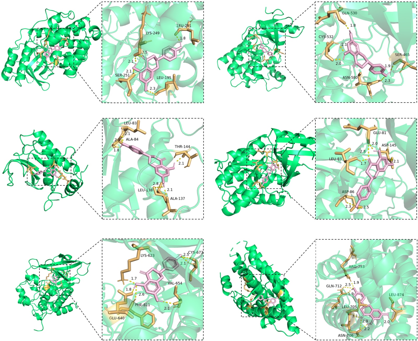 依据2.2.4节交集靶点PPI网络的拓扑学分析结果,选取度中心性(Degree)位于前10%的靶点作为分子对接的受体蛋白候选。并结合2.2.7节构建的“中药–有效成分–靶点–通路–疾病”多层级网络模型,筛选网络度值显著高于均值的关键有效成分作为配体分子。受体蛋白的三维结构信息通过蛋白质结构数据库Protein Data Bank (PDB)获取,检索时限定为来源于人类(Homo sapiens)的晶体结构,并下载相应pdb格式文件。配体分子的三维结构由PubChem数据库获得,通过检索其CAS号获取3D结构并下载为sdf格式文件;随后使用OpenBabelGUI将配体sdf文件转换为pdb格式。将受体蛋白与配体小分子的pdb文件导入AutoDock 4.2软件进行对接前处理,完成预处理后开展分子对接并保存对接结果。最终,利用微生信平台对对接结果进行热图展示,并通过PyMOL软件对受体–配体结合模式进行可视化分析。