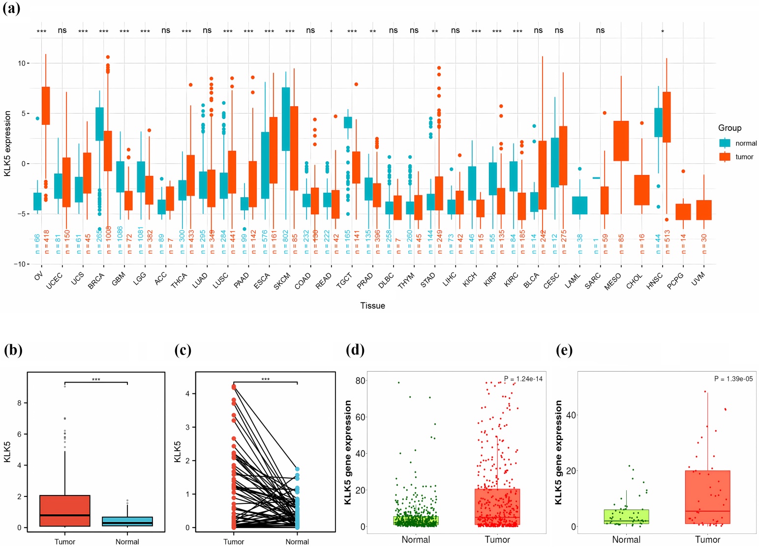 KLK5在9种肿瘤中显著上调(P < 0.05) (图1(a)),TC中表达显著高于癌旁正常组织(P < 0.001) (图1(b)、图1(d)和图1(e)),配对样本同样证实(P < 0.001) (图1(c))。