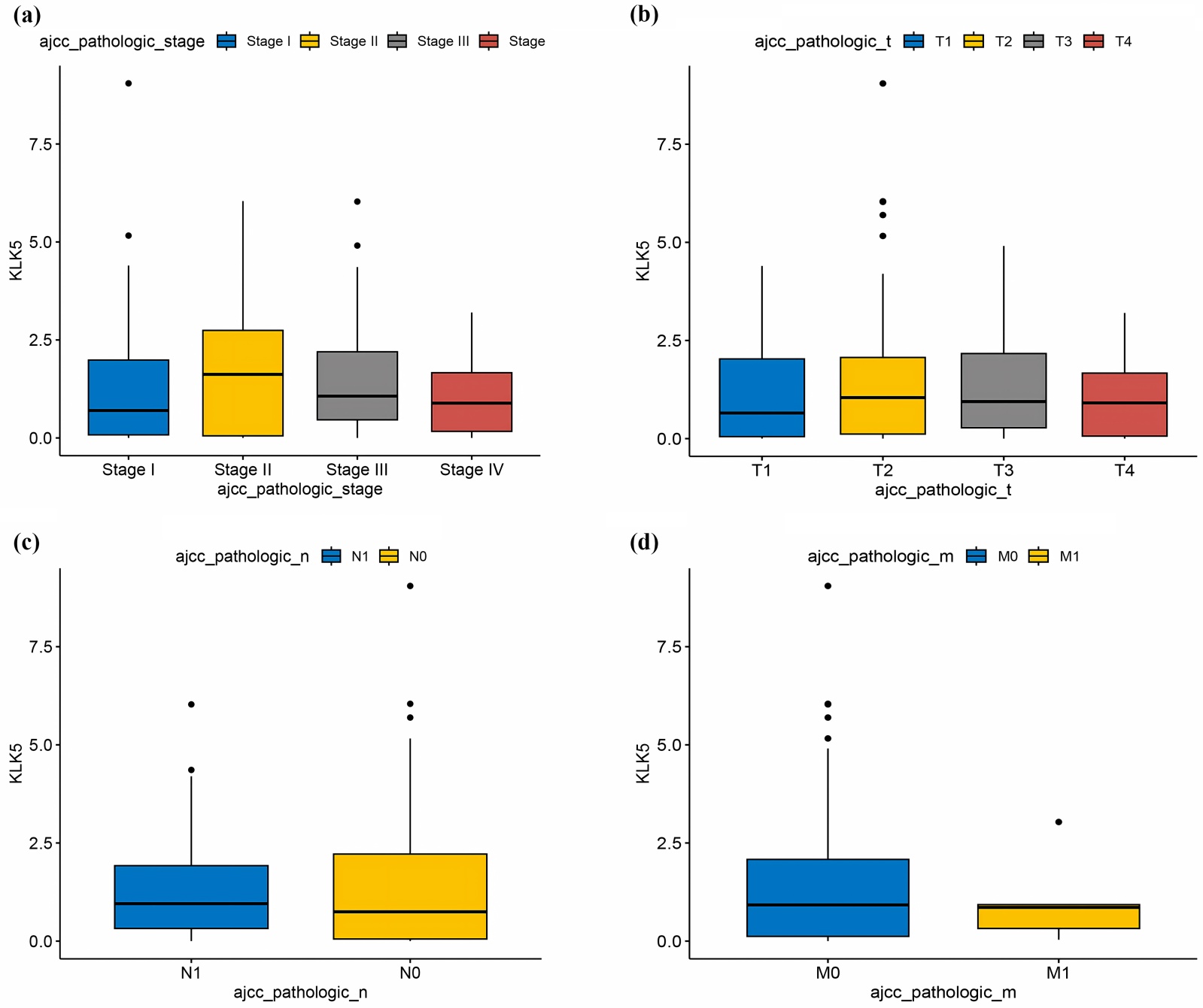 注:(a) TCGA数据库中Stage I、II、III和IV分期甲状腺癌患者中KLK5的相对表达;(b) TCGA数据库中T1、T2、T3和T4分期甲状腺癌患者中KLK5的相对表达;(c) TCGA数据库中N0、N1分期甲状腺癌患者中KLK5的相对表达;(d) TCGA数据库中M0和M1分期甲状腺癌患者中KLK5的相对表达。