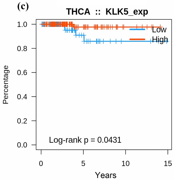 甲状腺癌(Thyroid Cancer, TC)全球发病率持续上升,在2022年全球癌症统计中显示,甲状腺癌(TC)在女性中发病率位列第五[1]。TC中最常见亚型是乳头状甲状腺癌(Papillary Thyroid Carcinoma, PTC),占甲状腺癌的80%~84% [2] [3]。PTC是公认的分化较好的恶性肿瘤,大多数甲状腺癌可以通过手术、内分泌抑制治疗和碘放射治疗得到有效控制,预后良好;但局部侵袭、远处转移及放射性碘难治病例仍是临床难点[4],寻找可预测复发、转移及治疗反应的新型标志物具有重要价值。组织激肽释放酶(kallikrein-related Peptidases, KLKs)最初在胰腺中发现,包括人组织激肽释放酶(KLK1)和14种激肽释放酶相关肽酶(KLK2~KLK15),由人类基因组中最大的蛋白酶基因连续簇编码,是具有不同表达模式和生理作用的分泌型丝氨酸蛋白酶[5]。KLK5 (又名kallikrein like gene 2 [KLK-L2]、人角质层胰蛋白酶[HSCTE])是KLKs家族的重要成员之一,具有丝氨酸蛋白酶活性,可降解细胞外基质并激活生长因子通路,促进肿瘤侵袭转移[6]-[8]。已有研究提示KLK5在宫颈癌等实体瘤中与放疗耐受、复发及不良预后相关[9],但在TC中的系统研究尚少。本文拟通过多数据库整合分析,阐明KLK5在TC中的表达、预后价值及相关性分析。