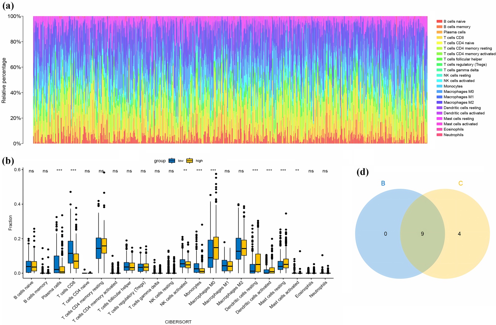THCA中22种免疫细胞的丰度(图4(a))。在巨噬细胞M0、静息树突细胞、活化树突细胞和静息肥大细胞中KLK5高表达组显著高于低表达组,在浆细胞、CD8+T细胞、活化记忆CD4+T细胞、单核细胞和活化肥大细胞中低表达组显著高于高表达组(P < 0.01) (图4(b))。未成熟的B细胞、巨噬细胞M2、静息肥大细胞和活化肥大细胞表达与KLK5表达呈正相关,记忆B细胞、单核细胞、活化NK细胞、浆细胞、CD8+T细胞和滤泡调节性T细胞表达与KLK5表达呈负相关(P < 0.05) (图4(c))。并通过取两者交集发现,结果同差异表达基因(图4(d))。