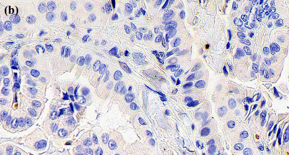 注:(a) KLK5在甲状腺癌组织中表达;(b) KLK5在甲状腺癌旁正常组织中表达。