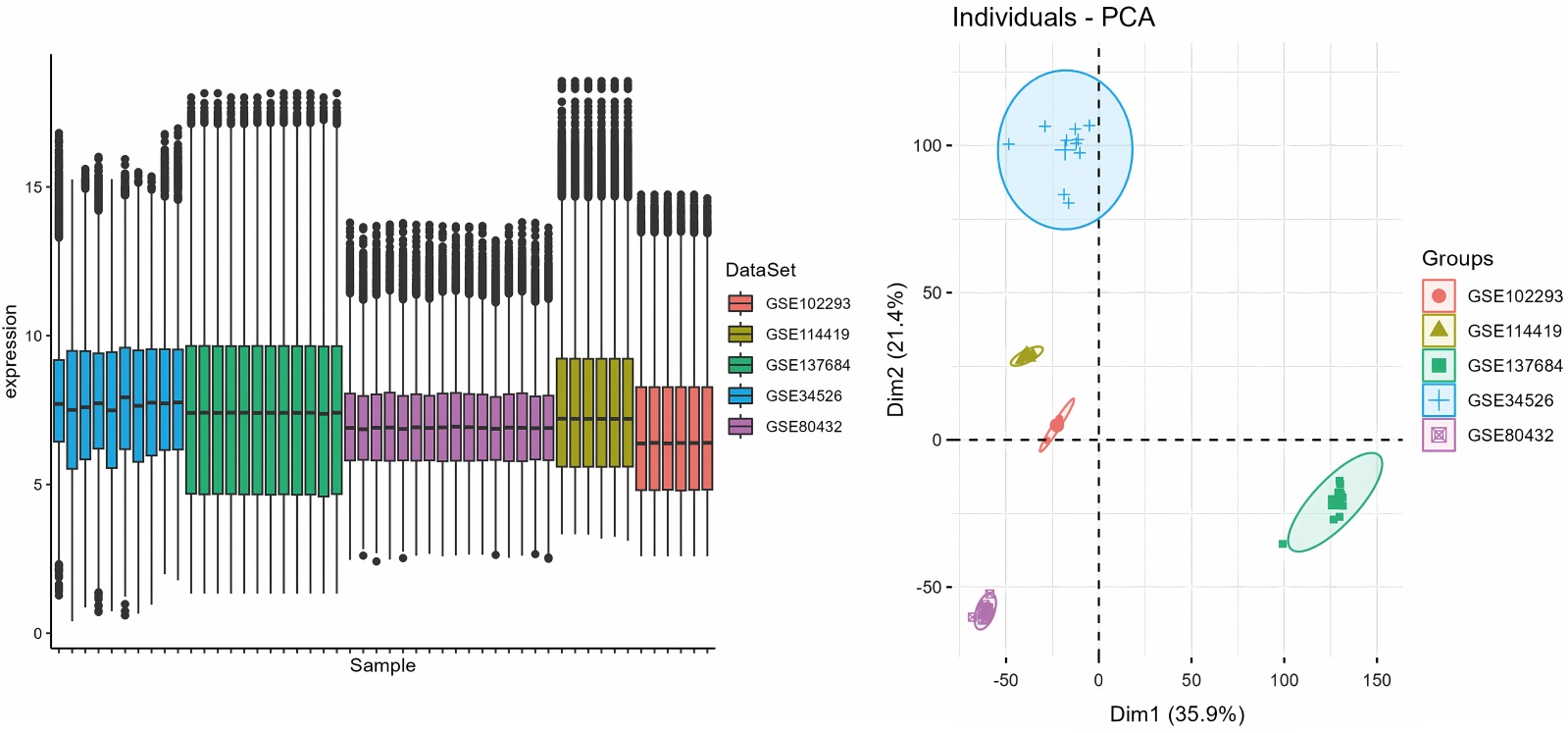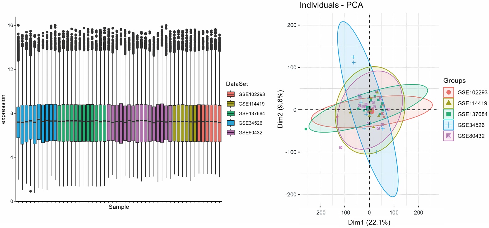 注:批次效应去除后的箱线图和PCA展示了不同数据集之间的一致表达模式。
