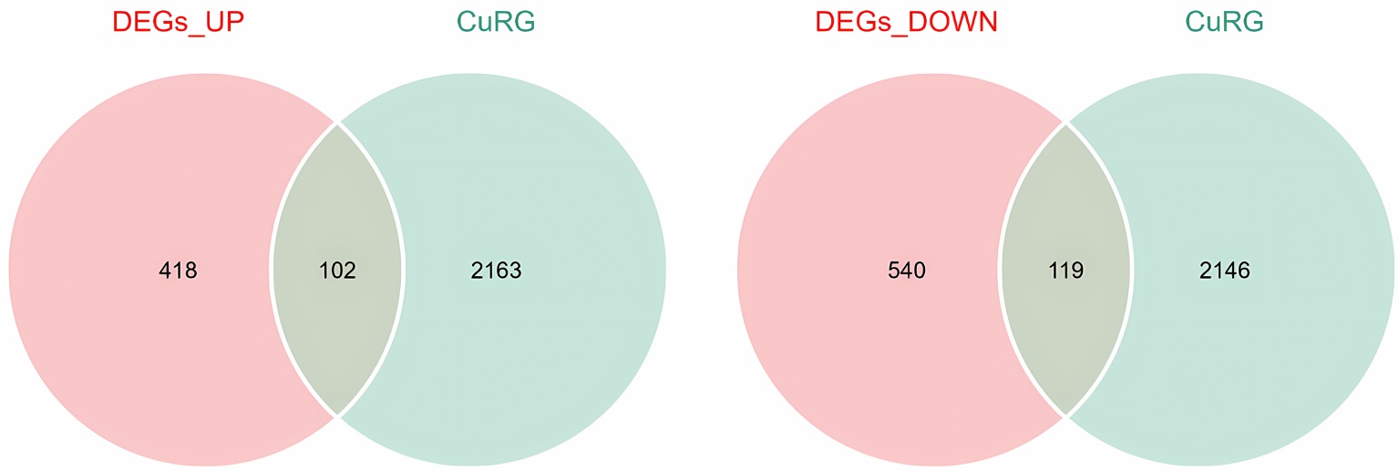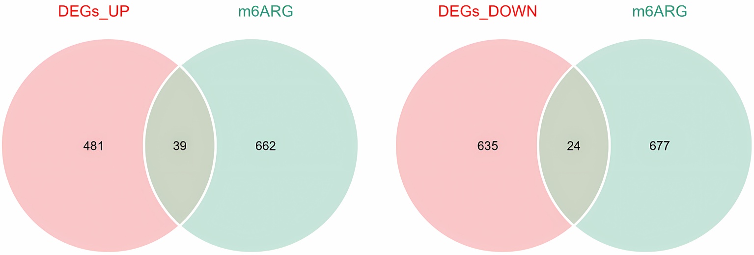 注:韦恩图展示了DEGs与铜死亡相关基因(a)以及与m6A靶基因(b)的交集。