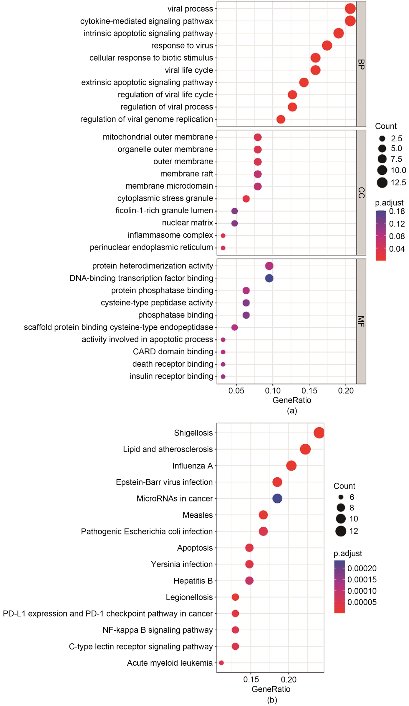 Figure 6. (a) GO functional enrichment analysis (DECuRGs); (b) KEGG functional enrichment analysis (DECuRGs)