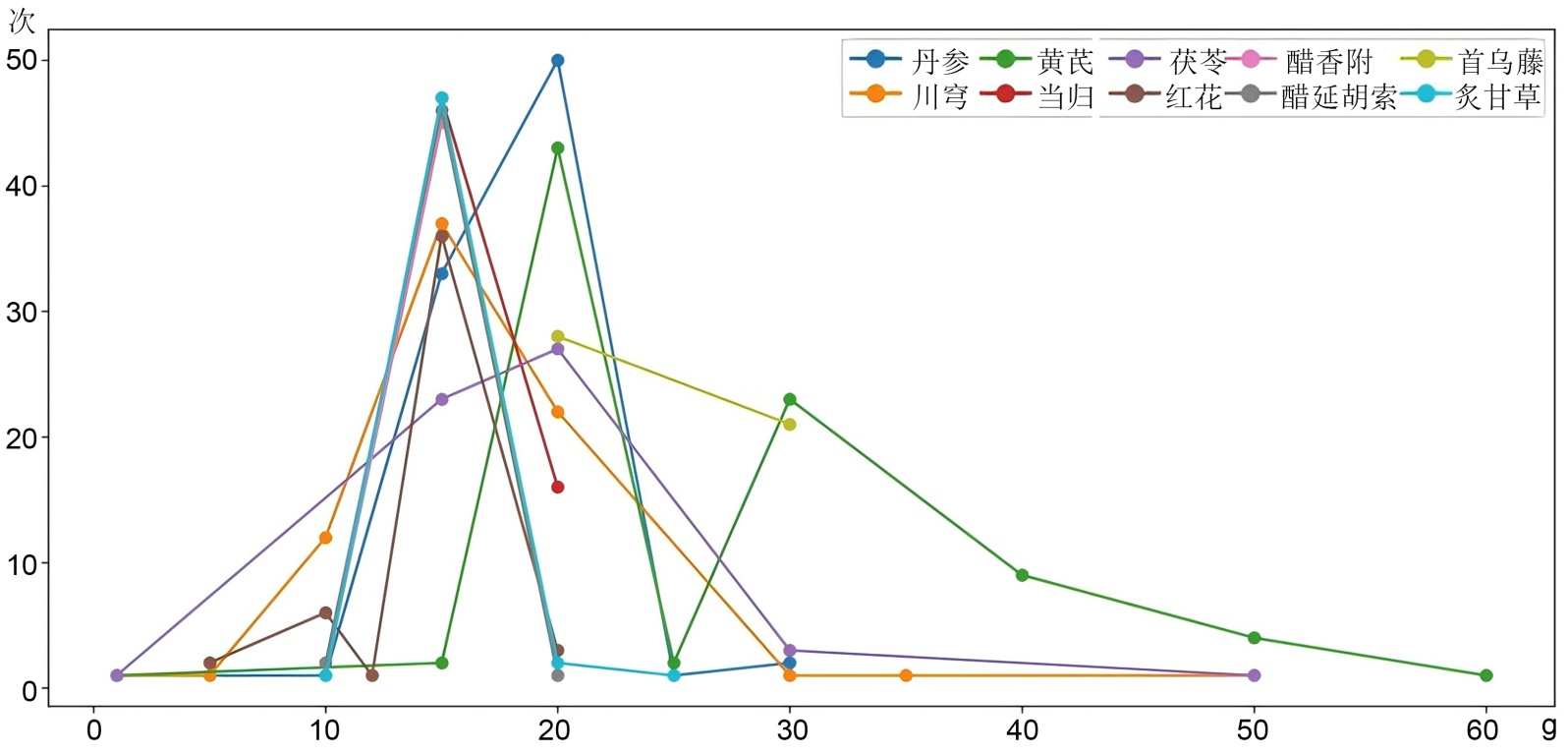 Figure 2. Frequency distribution line chart of high-frequency traditional Chinese medicine dosage