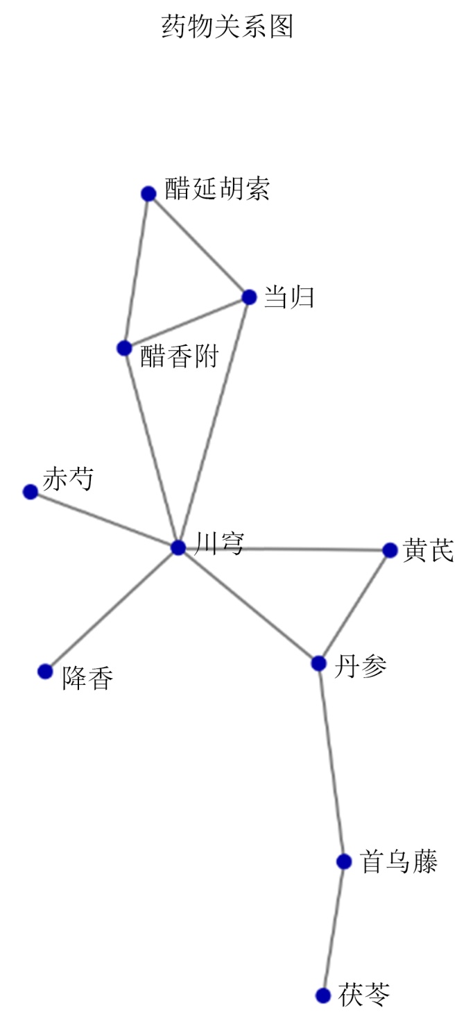 关联规则反映一个事物与其他事物之间的相互依存性和关联性,以频数分析为基础,采用Apriori算法进行关联规则分析,得出处方中出现频率高的药物组合,分析其中一味药物出现时,同时出现另一味药物的条件概率。药物间的关联规则通过指定支持度个数和置信度来寻找。支持度个数:指药物组合在总处方中出现的频次。置信度:“A→B”,当A药物出现后,B药物出现的概率(A药物出现后,本参数越接近1,B药物出现的概率越高)。依据处方数量,结合经验判断和不同参数提取数据的预读,将支持度个数设置为30,置信度设置为0.6,得到常用药对12个,包含中药10味。其中,使用频次最高的药对为“丹参–黄芪”“丹参–川芎”,显示益气养血药物与活血药物之间联系紧密。此外,“当归–醋延胡索”“醋香附–醋延胡索”等组合反映出理气止痛与活血化瘀并用的特点。对常用药对进行规则分析,置信度最高的药对为“降香→川芎”。网络结构展示图基于关联规则分析结果采用网络可视化方式,直观地展示出药物之间的关联性,川芎、丹参、当归居于核心位置,相互之间联系密切,其他药物与上述3味药物有着直接或间接关联,属于常用配伍药物(见表3、图3)。