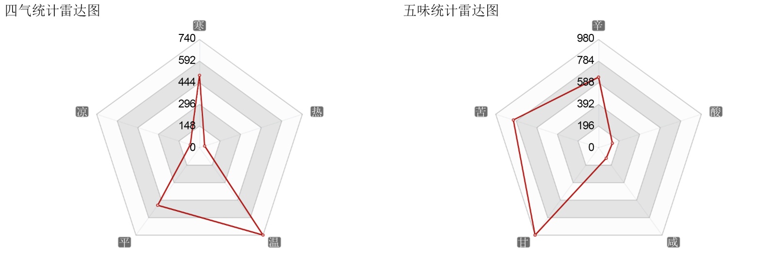 由用药属性统计分析发现,四气以温、平为主,温、平之性多用于寒凉之症,龙江医派代表医家认为心主血脉,寒性凝滞则易使血不行,血不行易致心脉不通,不通则痛,故用药以温、平为主。五味以甘、苦、辛为主,龙江医派代表医家提出东北地区地处高寒,饮食多肥甘厚味、嗜饮烈酒,易损伤脾胃运化,致湿浊痰热内生,久则阻滞气机,灼伤津血,形成气滞血瘀、痰瘀互结之病机,且北疆患者多因脾肾亏虚、气虚无力运血,病程日久则气血两滞、络脉阻闭而发病[11]。甘味能补、能和、能缓,采用甘味补益,正气足则邪不可侵;苦能泄、能燥、能坚,苦味药可燥湿化痰、调畅气机;辛能散、能行,行气药、活血药多具辛味,推动气血运行。