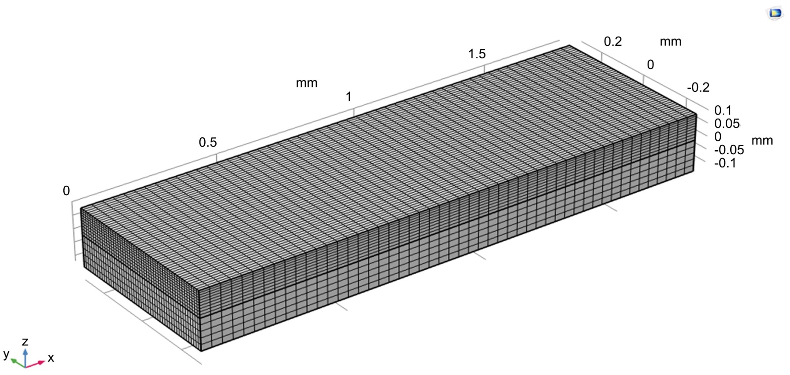 本研究为模拟激光清洗过程中的温度及应力变化,在COMSOL Multiphysics有限元软件中同时引入了固体传热、变形几何和固体力学模块。通过多物理场耦合计算,并在漆层表面设置广义热通量边界条件进行瞬态分析,最终获得了材料在不同时刻、不同位置上的温度分布与应力状态。所建几何模型尺寸为2 mm × 0.5 mm × 0.2 mm,上层为聚氨酯漆,下层为AH32船用钢基底,各厚0.1 mm。由于激光直射的漆层热流密度高,为提升计算精度,对漆层进行了细化,而基底则采用常规划分,如图1所示。