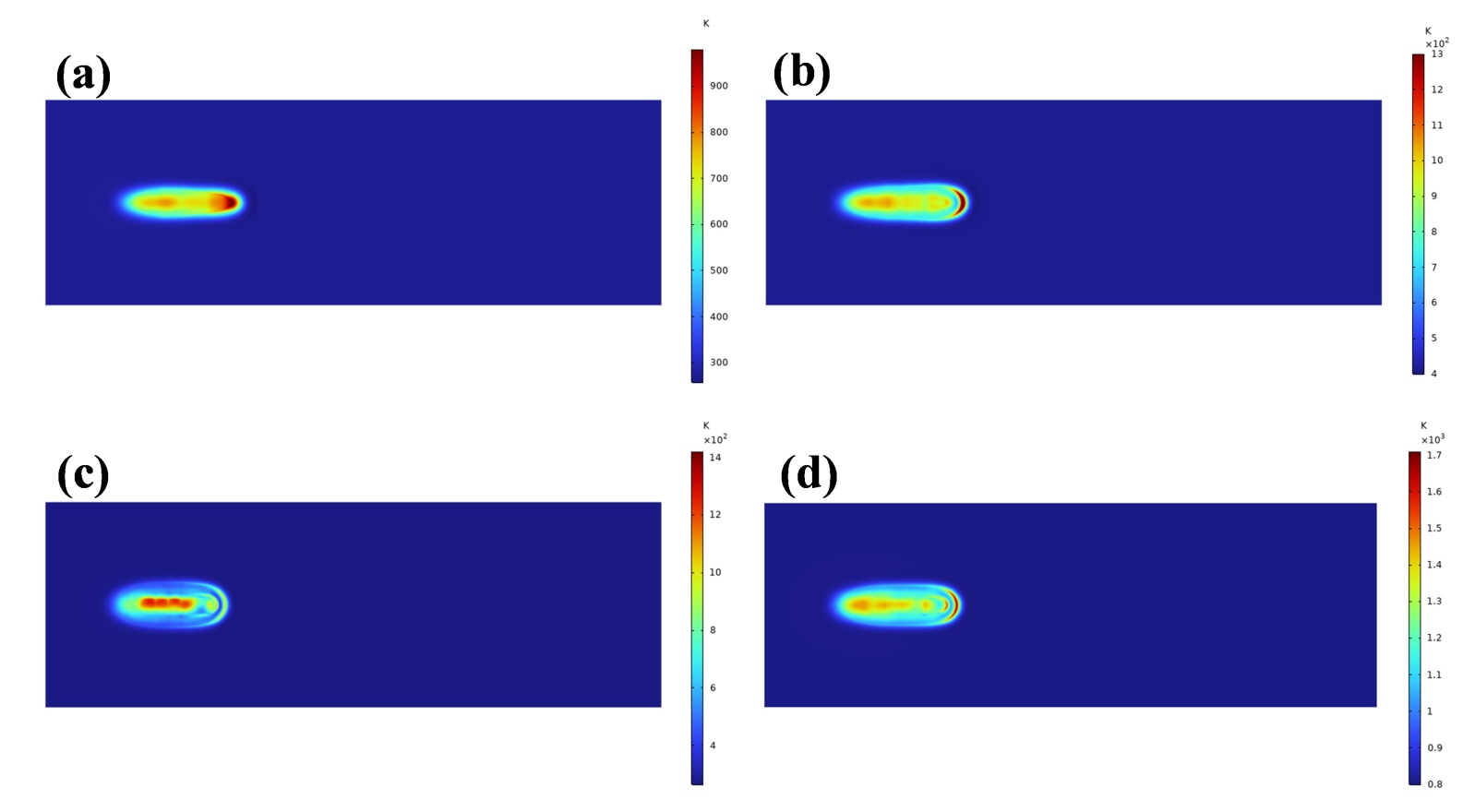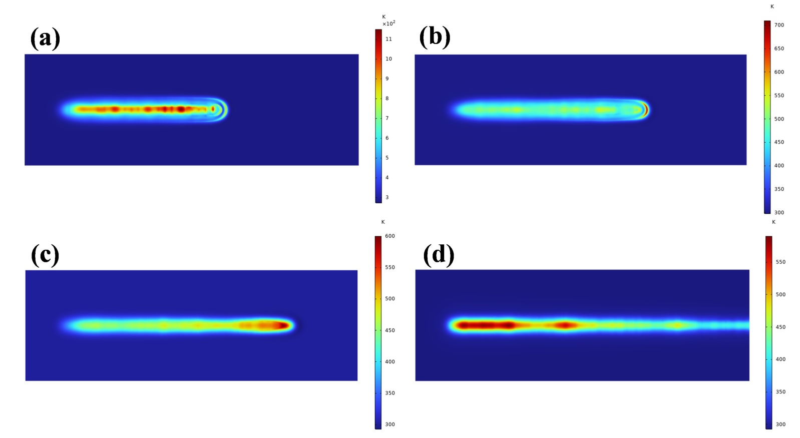 图4. 不同扫描速度下漆层表面温度场分布:(a) 2500 mm/s;(b) 5000 mm/s;(c) 7500 mm/s;(d) 10,000 mm/s